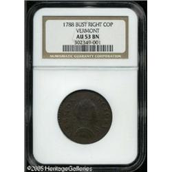 <B>1788 COPPER Vermont Copper, Bust Right AU53 NGC.</B></I> RR-16, Bressett 15-S, R.1. A nicely centered example with deep golden-brown and walnut-brown patina. The peripheral legends and design elements are bold, while the centers are typically struck and offer a whisper of verdigris. Obviously a well cared for piece, since neither side has any visible marks. A high grade for a Vermont Copper. Listed on page 58 of the 2005 <I>Guide Book.</B></I><BR><I>Ex: H.C. Whipple Collection (Tom Elder, 2/21), lot 445; Hillyer Ryder; F.C.C. Boyd; John J. Ford, Jr. Collection, Part One (Stack's, 10/03), lot 44.</B></I> Lot:5040