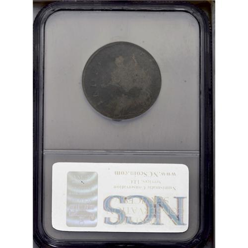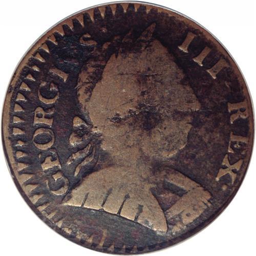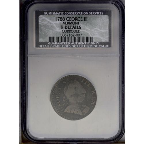 <B>1788<COPPER> Vermont Copper, GEORGIVS III REX--Corroded--NCS. Fine Details.</B></I> Ryder-31, Bressett 24-U, Low R.5. A counterfeit British halfpenny obverse is muled with a Vermont reverse, which was also used for Ryder varieties 25, 28, 29, and 39. This rarely encountered variety is sometimes confused with the common 1787 Vermont Britannia variety, which features a counterfeit halfpenny <I>reverse.</B></I> Medium brown fields accompany lighter tan devices. A bit off center, toward 3 o'clock on the obverse and toward 4:30 on the reverse, the date and LIB are mostly off the flan. A minor rim ding on the reverse at 2:30, a mint-made planchet flaw near the ear, and a patch of corrosion on the V in GEORGIVS are the sole detractions. Listed on page 69 of the 2006 <I>Guide Book.</B></I> <BR><BR><B>Important notice:</B> Heritage usually auctions material at the rate of 200-250 lots per hour. On some occasions eBay Live bid software or the Internet may not be able to keep up with the pace of the auction. We recommend placing a realistic absentee bid now as insurance to avoid disappointment. Occasionally the auctioneer may eliminate or reject an eBay Live bid, and the auctioneer may also reopen a lot after the close of the eBay live bidding (usually because we missed an audience bid), and may reject your bid even if it shows you as the winning bidder. By bidding via eBay Live, you agree that Heritage may award the lot to another bidder at its sole discretion under the circumstances described above or any other reasonable circumstances. Since eBay bids are not shown to us until we open the lot on the floor, we treat those bids just like floor bids. In most cases the floor responds before the eBay bid is presented to us, due to Internet lag time, so for consistency we have made it a policy that floor bids are always considered first over tie eBay live bids. Also please note that all Heritage lots purchased through eBay Live carry a 20% Buyer's Premium. Please make sure you read the Terms and Conditions before you bid. This lot is being auctioned in conjunction with a live floor auction by Heritage Galleries & Auctioneers. All final auction and invoice information will be supplied by Heritage Galleries & Auctioneers, and all other information should be considered preliminary. Lot:163 <BR><BR><B>Winning Notification and Billing:</B> After the FINAL session in this auction is complete, Heritage will send e-mail and snail mail invoices. This process normally takes several days. All final auction and invoice information will be supplied by Heritage Galleries & Auctioneers, and all other information should be considered preliminary. <BR><BR>This auction will be conducted on a live auction floor and over the Internet through eBay Live. If you choose to place an absentee bid, please take a moment to <font color='#0000ff'><u><a href='http://pages.ebay.com/liveauctions/help/before/laabsentee.html'>learn how eBay Live absentee bidding works</a></u></font><font color='#000000'>