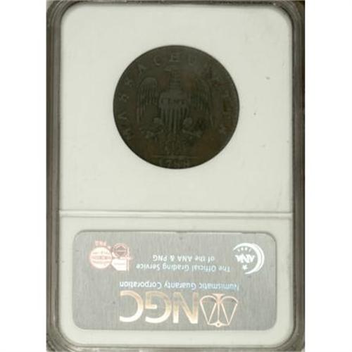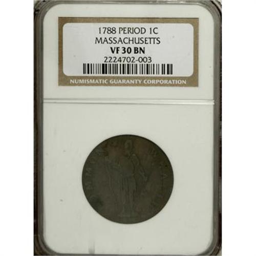 <B>1788 1C Massachusetts Cent, Period VF30 NGC.</B></I> Ryder 8-C, R.3. A generally unabraded medium brown state copper with unimportant buildup within the eagle and a subtle spot on the CO in COMMON. Listed on page 57 of the 2008 <I>Guide Book.</B></I><BR><BR><b>Shipping:</b> Coins & Currency (<a target="_blank" href="http://www.heritageauctions.com/common/shipping.php">view shipping information</a>)