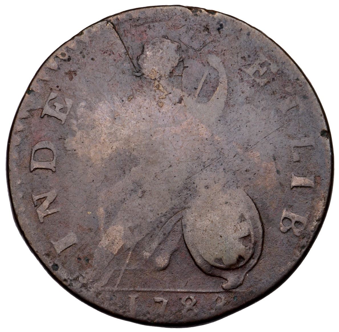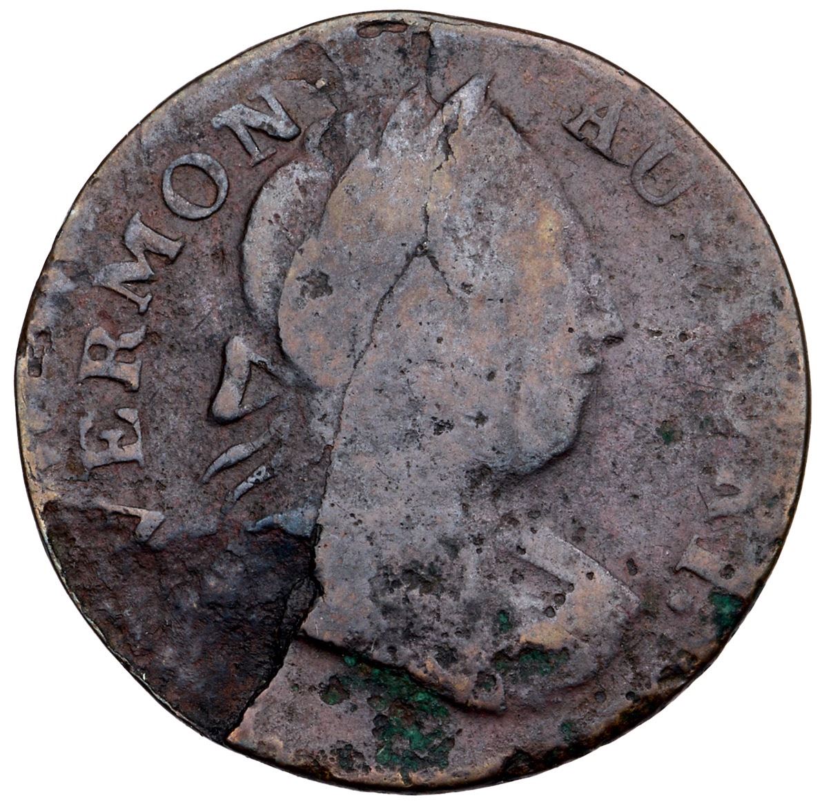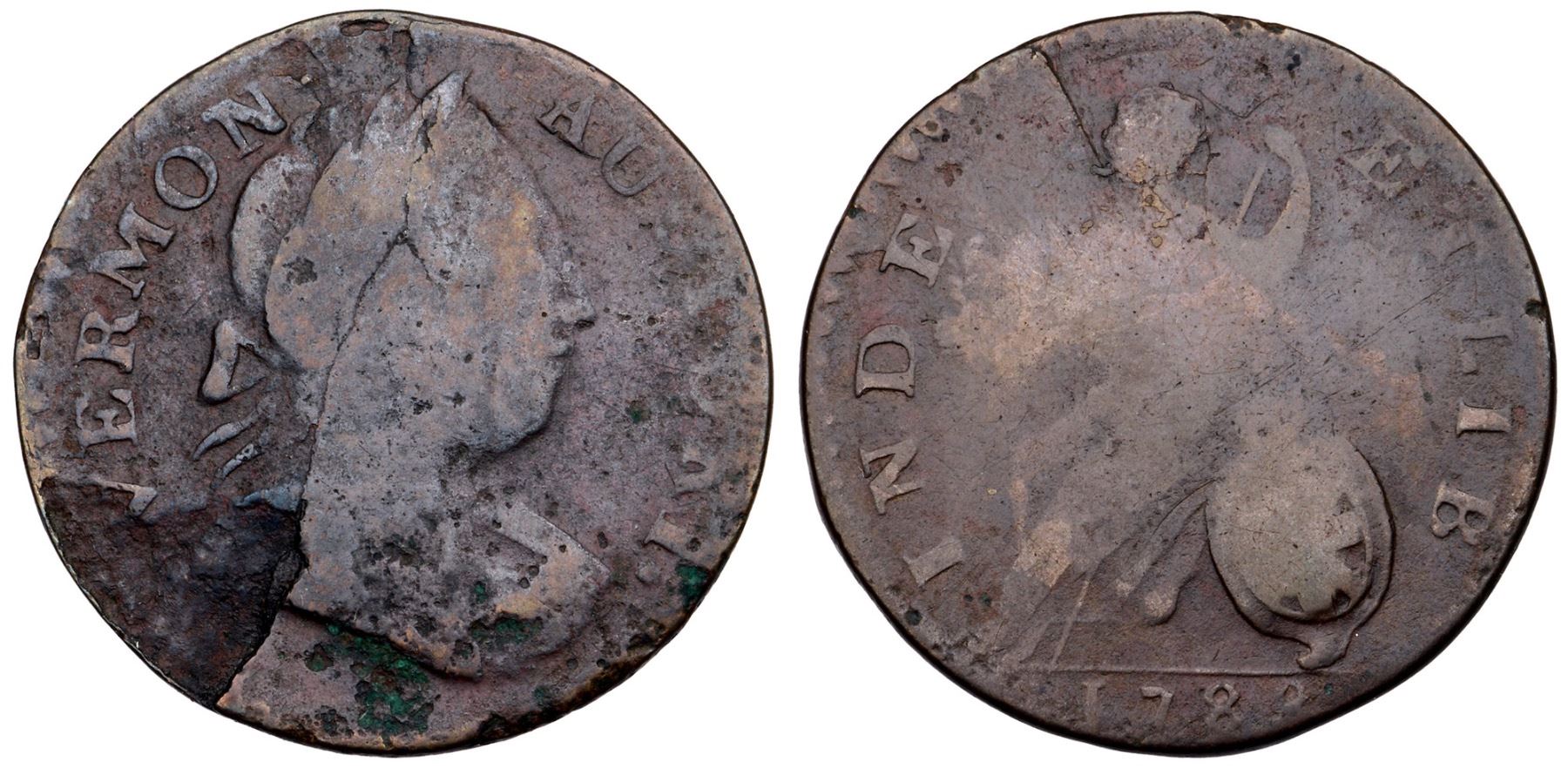 1788 RR-20 R-3 Bust Right Vermont G4 VG to fine sharpness but corroded with pitting and old verdigris on the lower obverse, and areas of shallow, crimson scale on both sides. There is also a rather notable planchet lamination on the lower obverse removing the shoulder, with a crack extending up through hair of the effigy, and faint scratches scattered on the reverse, most notably one in front of the face. LDS, with swelling on the reverse. Dark brown with hints of lighter tan on the reverse. Full date and legends. Ex; Doug Durasoff