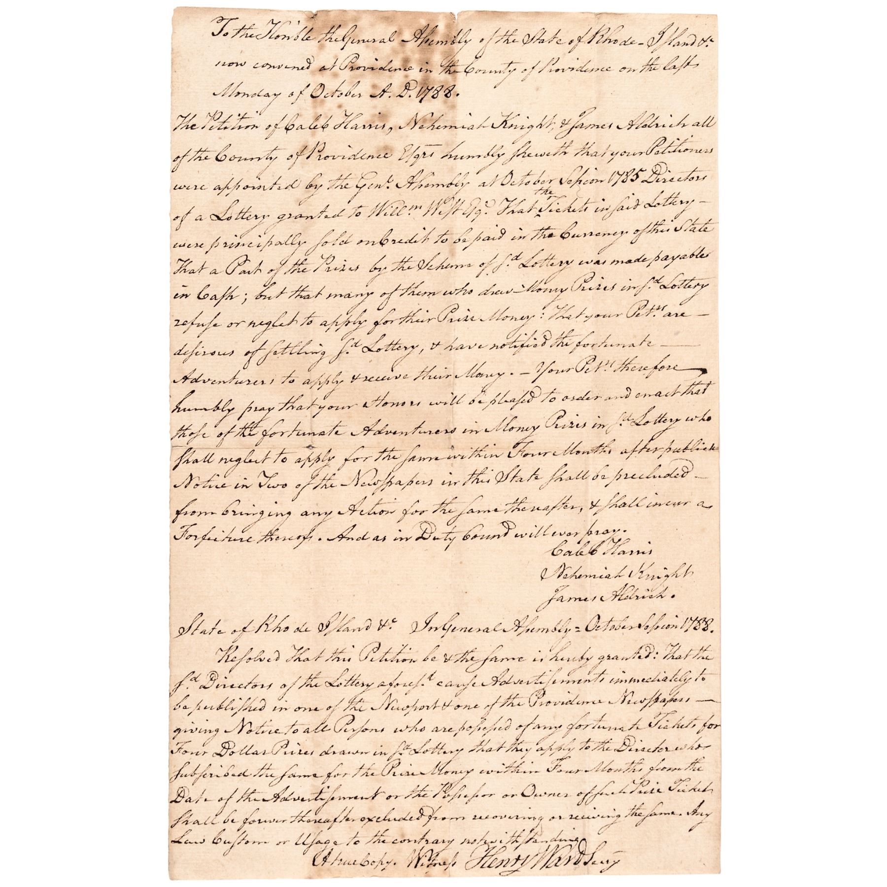 Unique Petition to the Rhode Island General Assembly from Caleb Harris, Nehemiah Knight and James Aldrich, 1 page, measuring 12.25” x 7.75” on fine quality laid period paper, Very Fine. Unusual content in which the Petitioners were wishing to settle out and close a Lottery previously held by William West circa 1785 as several of the “Winners” had failed or refused to come forward to claim their prizes, essentially forcing the Lottery to remain open. The Petitioners asked the State of Rhode Island to publish a notice in two newspapers, giving the Lottery Winners a final limit of four months to claim their prizes, or forfeit them thereafter. At the bottom of this Document there are notes that the Petition and Resolution was adopted. This Document signed as a period true copy, signed and witnessed by Henry Ward, as Secretary of Rhode Island. Henry Ward (1732-1797) of Newport, was Rhode Island's Secretary of State from 1760 to 1797. The text written in the bottom third of this Document reads:
