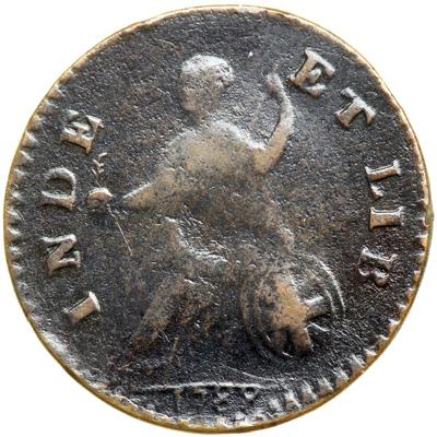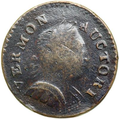 1788 Vermont Ryder-16 R1. VF-20. Slightly sharper with microscopic roughness under a glossy dark olive brown patina. The highpoints are a lighter shade of steel brown. No verdigris and just a few minor marks, including a dull scratch on the temple and a couple very light rim bruises on both sides. The date and legends are complete and clear. Weight 113.1 grains.