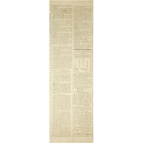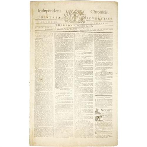 <B>The Bill of Rights in One of the Earliest Newspaper Printings Known</B></I> on page two of the <I>Independent Chronicle and the Universal Advertiser</B></I> for Thursday, October 1, 1789, Boston, Massachusetts, a four-page paper in fine condition with a superb, decorative woodcut in the masthead. Drafted by James Madison in 1789, at a time when disagreements between Federalists and Anti-Federalists threatened the ratification of the Constitution, the Bill of Rights calmed the fears of those who felt that not enough was being done to protect the basic principals of human liberties. As originally written and printed in this early newspaper, there were twelve proposed articles or amendments to the Constitution. Only the last ten were ratified by the required number of states by 1791 and they correspond to the first ten amendments as we know them today. An extremely important and historical newspaper.<BR><BR><b>Shipping:</b> Flat Material, Large (<a target="_blank" href="http://www.heritageauctions.com/common/shipping.php">view shipping information</a>)