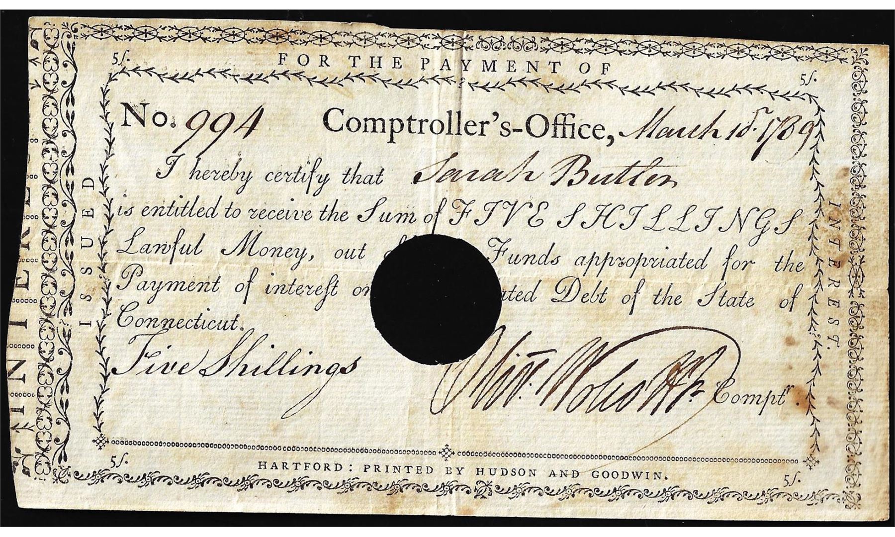 1789 Connecticut 5 Shillings Comptrollers Office Colonial Currency Note Cut Canceled