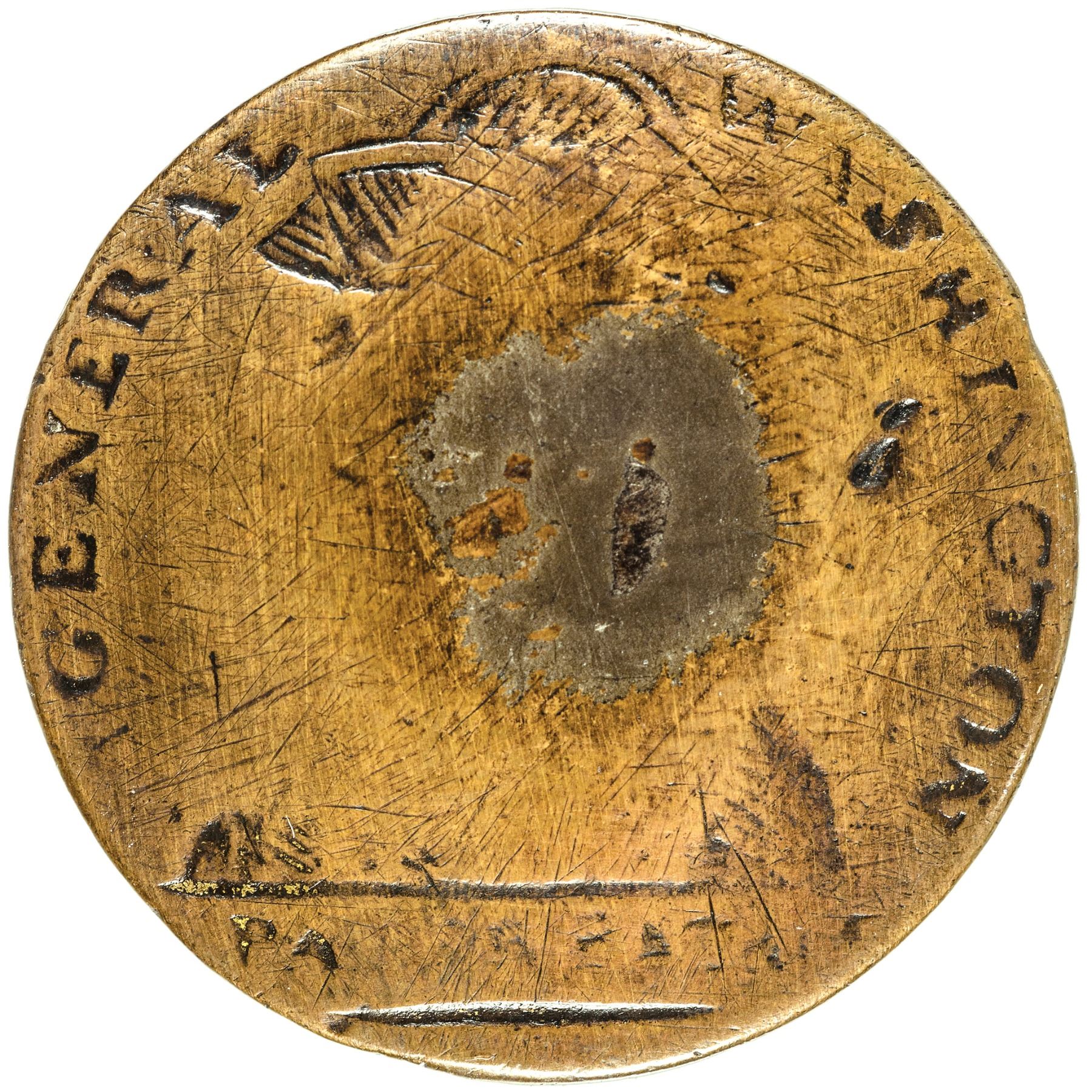 This current example is more typical in its quality and we have provided a conservative estimate range. It is worn on its central high points being Washington’s face. The name “GENERAL WASHINGTON” is very clear whereas “PATER PATRIAE” at the base below Washington’s half-lenght bust shows considerable wear. The original shank on the reverse is straight and solidly in place. This buttom is absolutely authentic and original. Its design features worn from actual use, including most of its central detail, yet much of the text and its overall design showing George Washington’s military hat is unmistakable. A “Key” rarity, this is the only “GENERAL WASHINGTON - PATER PATRIAE” design specimen we have ever offered in thirty-five years. This remarkable rare Inaugural Button type is missing in virtually all collections.