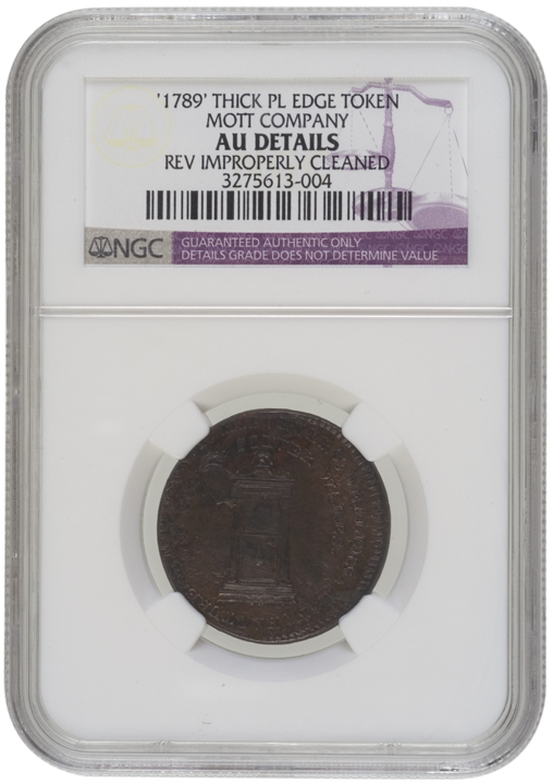 1789 Mott Token. Thick Planchet. Plain Edge. Reverse improperly cleaned. NGC graded Details of About Uncirculated .