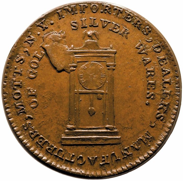 167.3 grains. Both sides are well centered, having no major detractions on this impressive looking Choice Mint State 1789 Mott Token. This coin has lightly glossy original surfaces with an attractive natural chestnut-brown color. Later die state with the distinctive obverse die cud at left corner of the clock. The clock displays sharpness with the individual hands of the clock showing the time, being so detailed the time is actually readable.