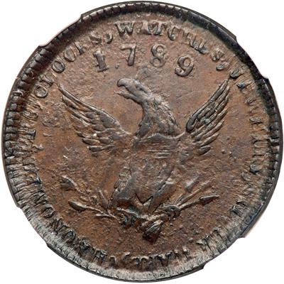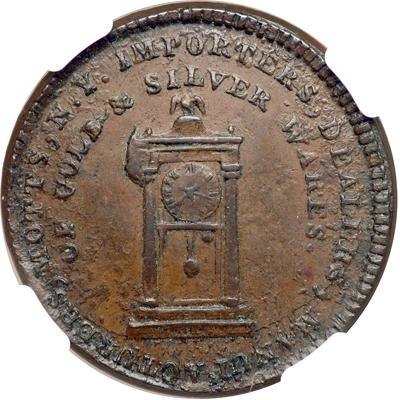 1789 Mott Token on Thick Planchet Breen-1020. NGC graded MS-64 Brown. Glossy chocolate brown with darker steel brown toning on the highpoints of the design and slightly lighter brown toning in the protected areas. No spots, stains, or contact marks and well centered on a choice planchet. Struck from an intermediate state of the dies with tiny lumps from fine die rust scattered over both sides. The die rust is strongest around the legend close to the dentils, but it shows in the fields closer to the centers as well. In spite of the die rust, this piece is nicely struck with the numerals and hands of the clock clearly visible. In a new NGC 4 pronged holder. Pop 4; 3 finer in 65BN.