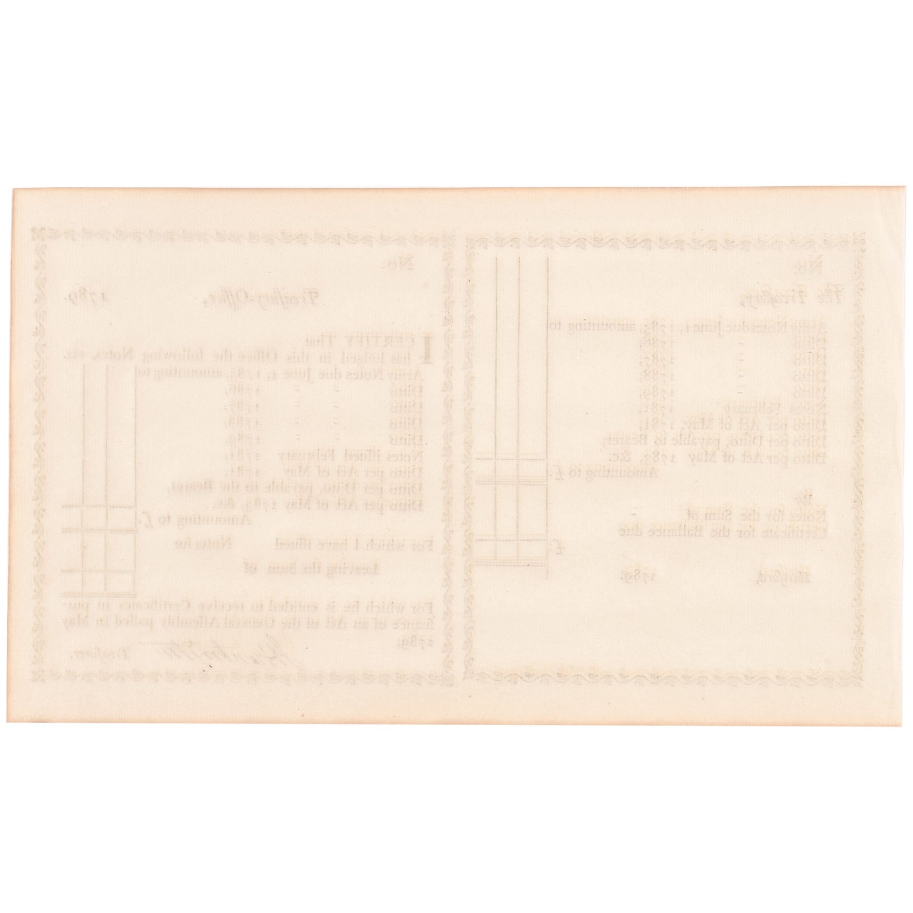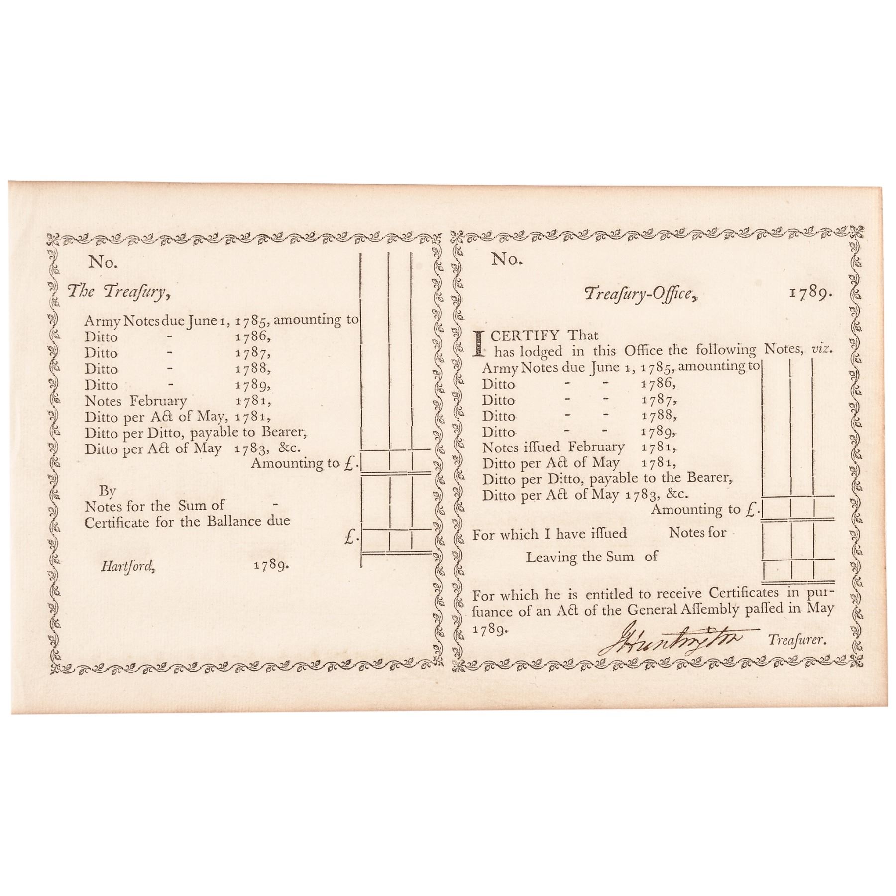 1789-Dated Federal Period, Partially-Printed Document Signed, “J Huntington,” as Treasurer, measuring 12.5” x 7.5”, (Hartford, CT.), Gem Crisp Mint. This is an unused yet properly Pre-Signed, 1789 Connecticut Treasury Office Document. It was to be used for reporting on Payment Certificate Notes issued to Continental Army Revolutionary War Soldiers, who’s notes were to be turned in for payment to the Treasury. This is an unused, pristine full Uncut Double-page recording sheet for that purpose. It is boldly printed in black, fresh and bright having lots of original press text embossing remaining within the quality laid watermarked period paper, attesting to its originality. The signature of Revolutionary War General Jedediah Huntington is quite magnificent, being a bold deep brown exactly as it appeared on the day it was signed, measuring a full 2” long and lovely for display. (Please see our online website for more about General Jedediah Huntington.)