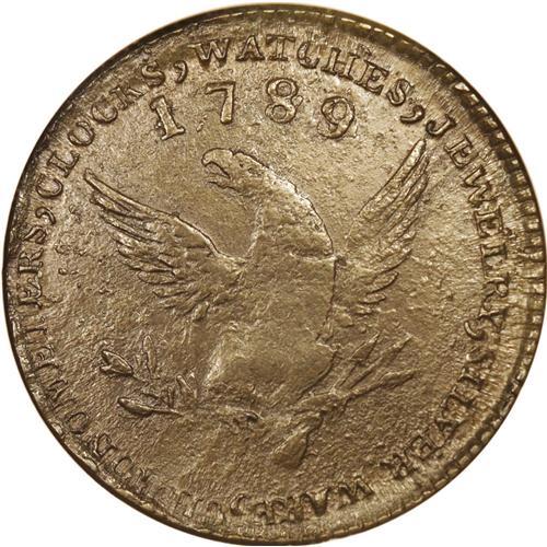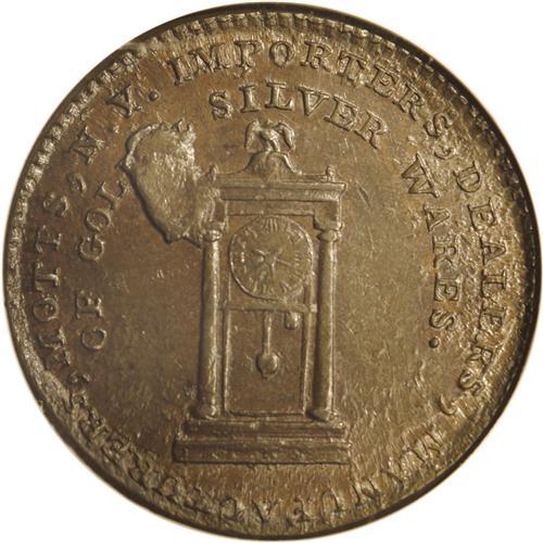 <B>1789<TOKEN> Mott Token, Thick Planchet, Plain Edge MS65 Brown NGC.</B></I> Breen-1020. A lustrous medium brown Gem with only minor obverse marks. The clock numerals are clear, while the eagle's body is softly defined, as usual for this later die state. The borders are flowlined, as made, and a prominent die break emerges from the upper left clock corner. One of just three pieces certified as MS65 by NGC (6/06) with none finer. PCGS has yet to certify any pieces above the MS64 level. Listed on page 70 of the 2007 <I>Guide Book.</B></I>