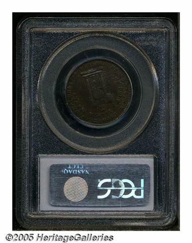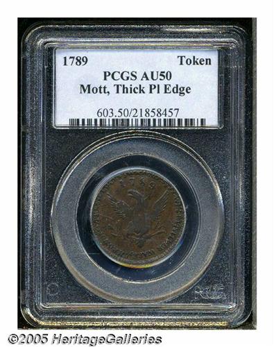 <B>1789<TOKEN> Mott Token, Thick Planchet, Plain Edge AU50 PCGS.</B></I> Breen-1020. A deep chocolate-brown example that has a couple of moderate marks and a shallow strike-thru (as made) on the eagle's right (facing) shoulder. The die break from the clock encompasses the nearby ampersand but not the D in GOLD. The central reverse is softly defined, as always for the die state. Listed on page 60 of the 2005 <I>Guide Book.</B></I>