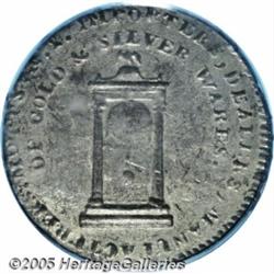<B>1789 TOKEN Mott Token, White Metal MS60 PCGS.</B></I> Breen-1027, "Extremely Rare." Although it is not known with certainty, it is believed by some that the Mott tokens, which were dated 1789, were actually struck in about 1807. Until recently, it was believed that these tokens were actually produced in 1789, but the issue has since been reexamined with differing opinions. What is known is that these tokens advertise a Mott firm who were importers of clocks, watches, jewelry, silverware, and goldware. These tokens were struck on both thick and thin copper planchets. In the <I>Standard Catalog of United States Tokens, 1700-1900,</B></I> Russell Rulau also lists one variety struck in pewter, which is called extremely rare. In his <I>Complete Encyclopedia,</B></I> Walter Breen also listed a pewter trial piece and made the same rarity comment. This is listed in his reference as Encyclopedia number 1027.<BR> This is the single known pewter or white metal Mott token that was listed by Breen in his Encyclopedia. It is possible that one or two others exist in pewter, although none have come to light. This example has lustrous light gray surfaces. It is an early die state without any evidence of the often seen die break on the obverse. This token appears to be on a rather thick planchet of considerable substance. The planchet was a little small in diameter, with most of the legends on both sides only partially visible. The dies were also slightly out of alignment, with the obverse nicely centered and the reverse slightly off-center. The early die state without the massive obverse die break that later appeared gives credence to the theory that this is a trial piece. On the other hand, clash marks on both sides suggests that it is not the earliest strike. Listed on page 60 of the 2005 <I>Guide Book.</B></I><BR><I>Ex: John Ford II (Stack's, 5/04), lot 326, where it brought $6,500; F.C.C. Boyd Estate; Jascha Heifetz Collection (J.C. Morgenthau, 3/15/38).</B></I>