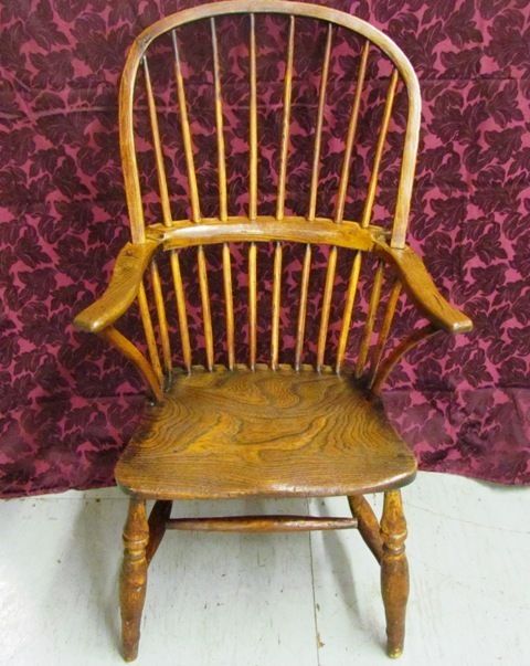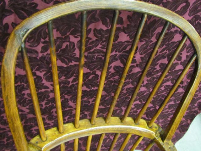 1790-1830 Bow Back Windsor Side Chair, turned out arms and 8 spindle back in patina condition 40" t x 23.5 " wide