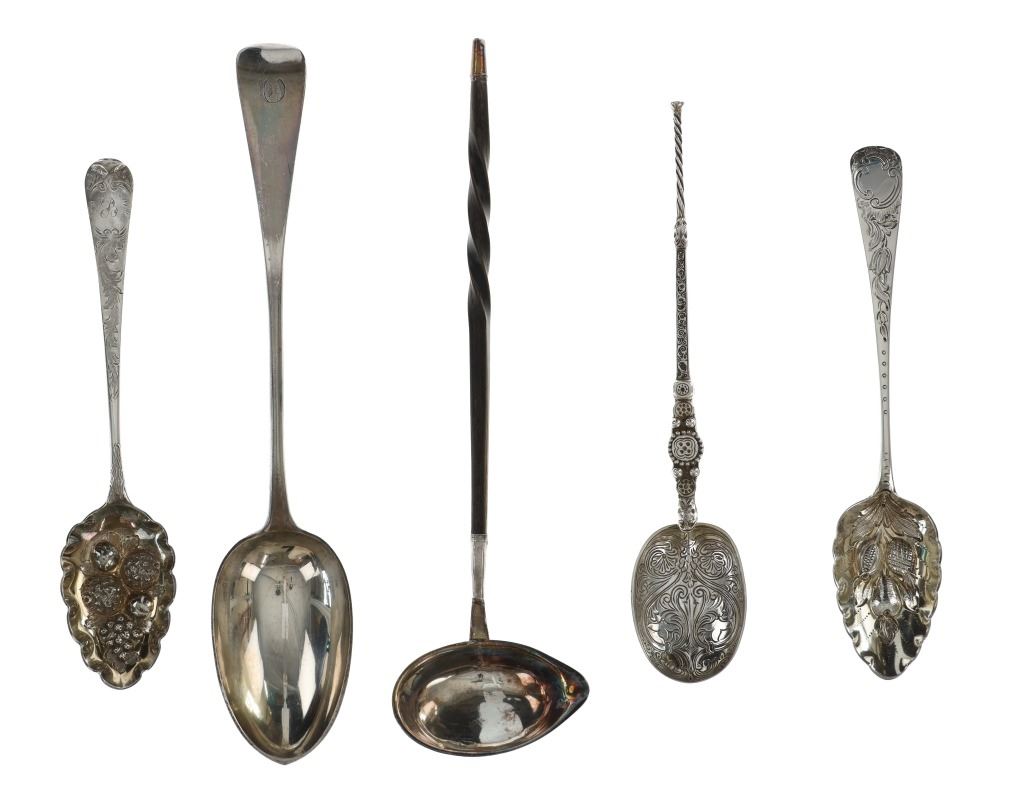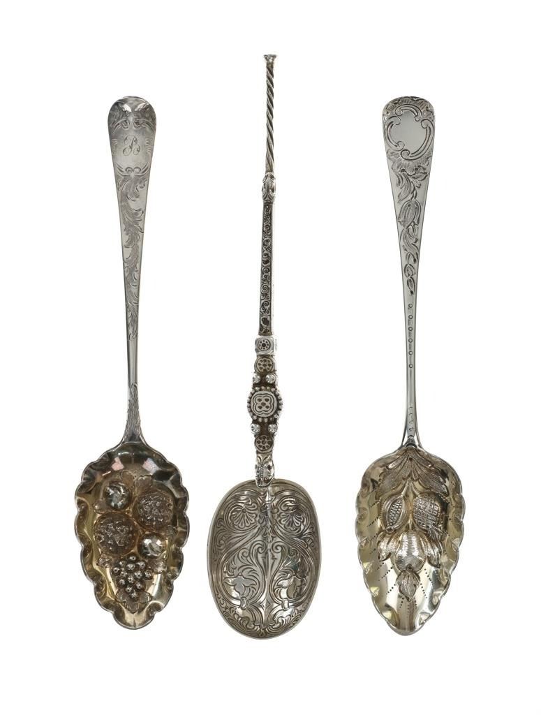 For your consideration are five decorative sterling spoons from various makers and locations circa 1790-1952. The first spoon in this collection was made by Henry Clifford Davis Ltd in Birmingham circa 1952. In April 1901, Henry Clifford Davis registered the first of many marks with the Birmingham Assay Office. Around 1910, this silversmith company operated at 121 Vyse Street in Hockley, Birmingham. A few years later, around 1913, the company moved to Harford Works, Harford Street, Hockley. The business produced fuse components and aircraft parts during World War I to aid in the war effort. The spoon shows a heavy sterling construction with intricate and elegant designs throughout the neck and the bowl of the spoon. The neck of the spoon shows a section of twisted sterling at the top leading down to intricate designs and beads of sterling towards the bottom ending with a face of an animal. The inside of the bowl shows elegant floral like designs while the back of the bowl shows the respective stampings. The makers mark reads, "HCD" in conjoined circles with the next stampings showing the Birmingham town mark, a lion passant indicating the quality of silver, the letter "C" indicating the year it was made (1952) and a Queens head showing it was made under Queen Elizabeth II rule. The second and largest spoon in this collection was made in London circa 1892 by Charles Boyton & Son. The spoon shows a heavy sterling construction with a design or initial on the top of the handle. The spoon shows no designs. The back of the handle shows the makers mark and other respective stampings. The makers mark reads, "CB" in two conjoined circles while the following stamps show a lion passant indicating the quality of the silver, the London town mark, and the letter "R" indicating it was made in 1892. The third spoon in this lot shows no makers mark or stampings present. The egg spoon shows a wood constructed handle with a twist towards the top. The top of the handle is capped with sterling. The bowl of the spoon features an egg shape and small spout off of the side of the bowl for draining liquids. The fourth spoon in this collection was made by Peter & Ann Bateman in London circa 1790. Peter and John Bateman, the sons of Hester Bateman, registered their mark in 1790. This partnership only lasted a short time because Jonathan, who wed Ann Downlinff, passed away in 1791. The mark was changed to Peter and Ann Bateman in 1791. The trademark of Peter Bateman, Ann Bateman, and William (I) Bateman was registered in 1800. Jonathan and Ann Bateman's son, William, entered a partnership with his uncle Peter and his mother Ann in 1800. After Ann retired in 1805, Peter and William (I) Bateman's new mark was registered. The spoon shows a highly detailed, decorative sterling spoon with floral and fruit designs in the bowl of the spoon. The neck of the spoon shows intricate floral designs and the letter "B" at the top of the handle. The back of the neck shows the makers mark reading, "PB" over "AB". The other stampings show a lion passant indicating the quality of the silver, the London town mark, the letter "P" indicating it was made in the year 1790 and lastly, a kings head showing it was made under King George III rule. The fifth and final spoon in this collection was made by Stephen Adams & Son in London circa 1811. The spoon shows a highly detailed, decorative sterling spoon with floral and fruit designs in the bowl of the spoon. The neck of the spoon shows intricate floral designs. The back of the handle shows the makers mark reading, "SA", with the other stampings showing a lion passant indicating the quality of the silver, the London town mark, a letter "Q" indicating the year it was made (1811), and a kings head indicating it was made under King George III. The spoons in this collection show good condition overall with some slight wear from their age and use over the many years, but no signs of obvious damage are noted. The spoons measure from 12 1/8" L x 2 5/16" W to 8 13/16" L x 1 7/8" W. The collective weight of the spoons is 428.9 grams.