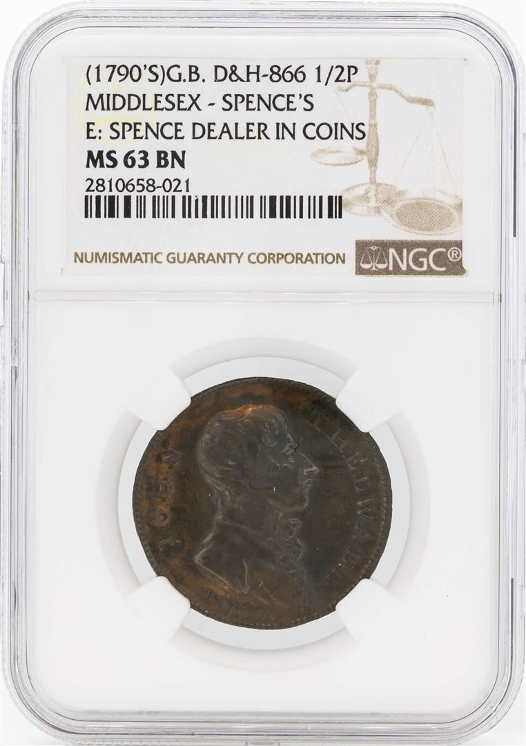 One 1790's Great Britain 1/2 Penny Middlesex Spences NGC MS63BN. NGC Certified.