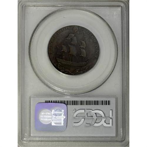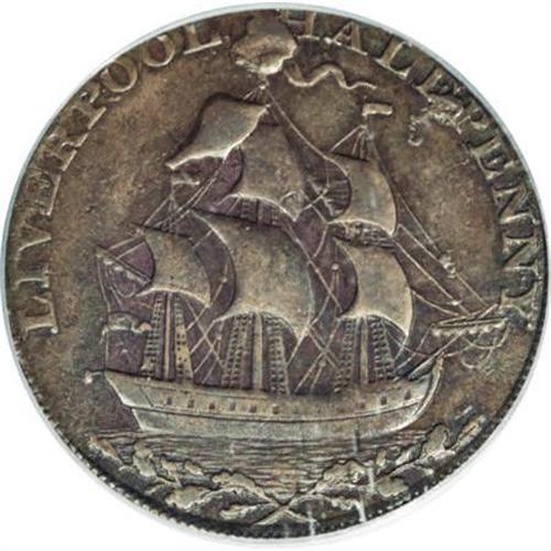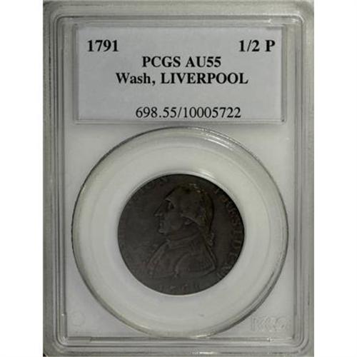 <B>1791 1/2P Washington Liverpool Halfpenny, Copper AU55 PCGS.</B></I> Baker-17, R.6. A medium brown piece that displays aquamarine shades once rotated beneath a light. This richly detailed example has minimal marks, and subtle granularity on the left obverse field is of little import. A challenging Washingtonia variety. Listed on page 77 of the 2008 <I>Guide Book. </B></I>Population: 6 in 55, 2 finer (1/08).<BR><I>Ex: Bowers and Merena, 11/02, lot 210.</B></I><BR><BR><b>Shipping:</b> Coins & Currency (<a target="_blank" href="http://www.heritageauctions.com/common/shipping.php">view shipping information</a>)