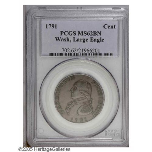 <B>1791<1C> Washington Large Eagle Cent MS62 Brown PCGS.</B></I> Baker-15, R.2. This is certainly one of the most visually appealing survivors of this early Federal era issue. Rich glossy brown toning overlays both sides in a generally even manner, although some deeper olive color is noted around the devices on the reverse. The surfaces are virtually silent in terms of mentionable distractions, and both sides are bold-to-sharp in strike. Listed on page 77 of the 2006 <I>Guide Book.</B></I>