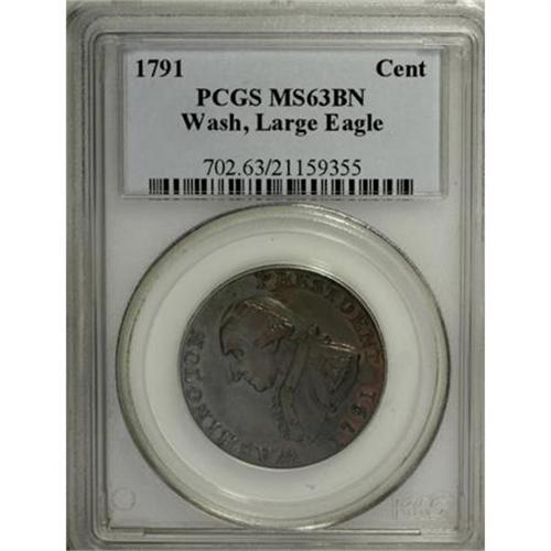 <B>1791 1C Washington Large Eagle Cent MS63 Brown PCGS.</B></I> Baker-15. This lovely representative is predominantly sea-green, but glimpses of slightly mellowed mint red are evident, particularly on the reverse. The strike is exacting, and the only remotely mentionable imperfection is a hint of granularity near the nose tip. Listed on page 77 of the 2008 <I>Guide Book. </B></I>Population: 22 in 63 Brown, 25 finer (1/08).<BR><BR><b>Shipping:</b> Coins & Currency (<a target="_blank" href="http://www.heritageauctions.com/common/shipping.php">view shipping information</a>)