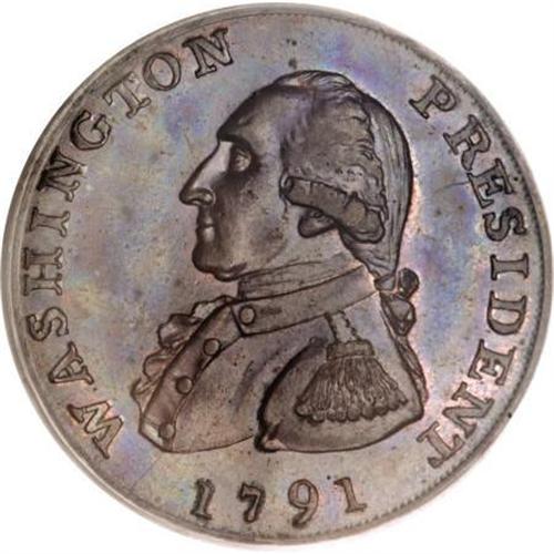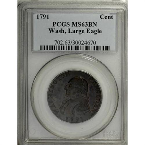<B>1791 1C Washington Large Eagle Cent MS63 Brown PCGS.</B></I> Baker-15. This boldly struck and semi-prooflike example is principally medium brown and steel blue, although glimpses of mint red reside in protected areas of the reverse. The obverse has a few tiny and unimportant gray spots. Teenaged engraver John Gregory Hancock of the Westwood Mint struck the Large Eagle and Small Eagle cents in an attempt to secure a Federal coinage contract. Instead, the United States established its own mint in 1793. Listed on page 77 of the 2008 <I>Guide Book</B></I>. Population: 22 in 63, 25 finer (1/08).<BR><BR><b>Shipping:</b> Coins & Currency (<a target="_blank" href="http://www.heritageauctions.com/common/shipping.php">view shipping information</a>)