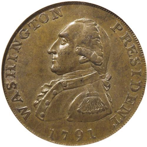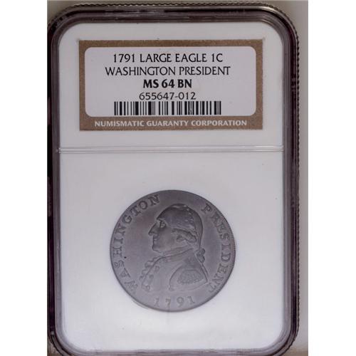 <B>1791<1C> Washington Large Eagle Cent MS64 Brown NGC.</B></I> Baker-15, R.2. This is certainly one of the most visually appealing survivors of this early Federal era issue. Rich glossy brown toning overlays both sides in a generally even manner. The surfaces are virtually silent in terms of mentionable distractions, and both sides are bold-to-sharp in strike. Listed on page 77 of the 2007 <I>Guide Book.</B></I>