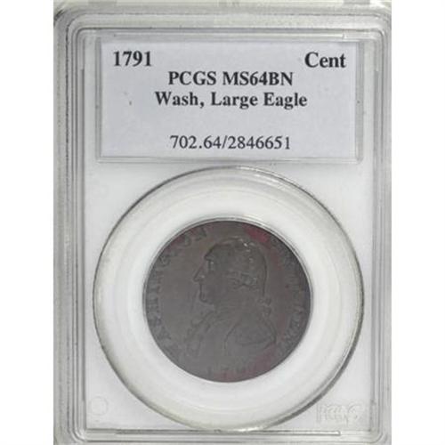 <B>1791 1C Washington Large Eagle Cent MS64 Brown PCGS.</B></I> Baker-15. A deep golden-brown near-Gem of this conditionally rare Washington issue. The strike is needle-sharp, and the fields are splendidly smooth. Minor reddish oxidation along the borders requires a loupe to identify. Listed on page 77 of the 2008 <I>Guide Book</B></I>. Population: 20 in 64 Brown, 5 finer (12/07).<BR><I>From The Liberty Collection of United States Colonial Coinage, Part Two.</B></I><BR><BR><b>Shipping:</b> Coins & Currency (<a target="_blank" href="http://www.heritageauctions.com/common/shipping.php">view shipping information</a>)
