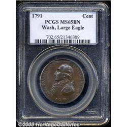 1791 1C Washington Large Eagle Cent MS65 Brown PCGS. Baker-15. D&H Middlesex-1049. Breen-1206. A beautiful token. The surfaces are medium brown and virtually flawless with a highly degree of reflectivity in the fields and a lovely accent of iridescence. The only minor problem worth mentioning is a small original planchet flaw to the left of the eagle's wing on the reverse. Important notice: Heritage usually auctions material at the rate of 200-250 lots per hour. On some occasions eBay Live bid software or the Internet may not be able to keep up with the pace of the auction. We recommend placing a realistic absentee bid now as insurance to avoid disappointment. Occasionally the auctioneer may eliminate or reject an eBay Live bid, and the auctioneer may also reopen a lot after the close of the eBay live bidding (usually because we missed an audience bid), and may reject your bid even if it shows you as the winning bidder. By bidding via eBay Live, you agree that Heritage may award the lot to another bidder at its sole discretion under the circumstances described above or any other reasonable circumstances. Also please note that all Heritage lots purchased through eBay Live carry a 20% Buyer's Premium. Please make sure you read the Terms and Conditions before you bid.