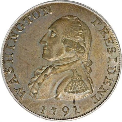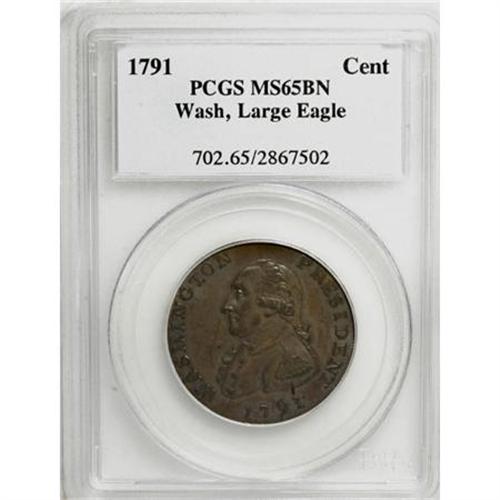<B>1791 1C Washington Large Eagle Cent MS65 Brown PCGS.</B></I> Baker-15. This remarkable Gem has a commendable strike, even on Washington's epaulet and on the hair above the ear. The semi-prooflike surfaces are unabraded and toned medium brown. Struck in an attempt to secure a coinage contract with the United States. Listed on page 77 of the 2008 <I>Guide Book</B></I>. Population: 4 in 65 Brown, 1 finer (12/07).<BR><I>From The Liberty Collection of United States Colonial Coinage.</B></I><BR><BR><b>Shipping:</b> Coins & Currency (<a target="_blank" href="http://www.heritageauctions.com/common/shipping.php">view shipping information</a>)