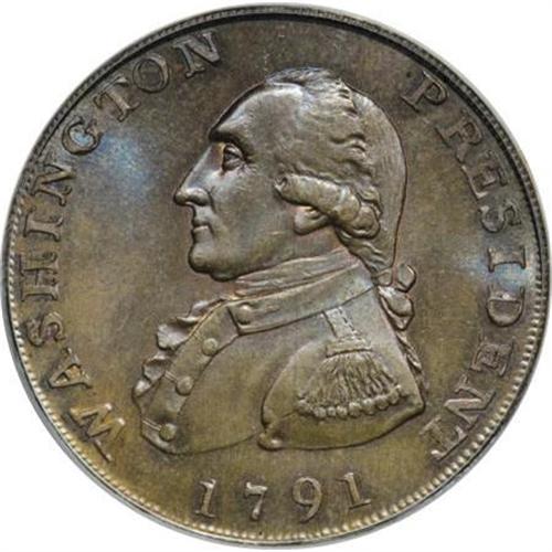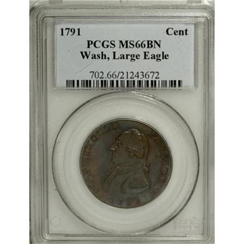 <B>1791 1C Washington Large Eagle Cent MS66 Brown PCGS.</B></I> Baker-15. The present lot is the only example certified as MS66 by PCGS, with none finer (6/07). Beautifully toned in powder-blue, fire-red, orange, and olive shades. The strike is essentially full, and both the fields and devices are remarkably unblemished. Listed on page 77 of the 2007 <I>Guide Book.</B></I><BR><BR><b>Shipping:</b> Coins & Currency (<a target="_blank" href="http://www.heritageauctions.com/common/shipping.php">view shipping information</a>)