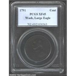 1791 1C Washington Large Eagle Cent XF45 PCGS. Baker-15, R.2. The dark brown surfaces have a hint of verdigris. Richly detailed, and with only light rub on the devices. A minor abrasion affects the right side of base of the tail. Listed on page 59 of the 2003 Guide Book. Important notice: We expect to be auctioning lots at the rate of 200-250 per hour. Sometimes eBay Premier live bid software cannot keep up with that pace, so we strongly recommend that you place a realistic proxy bid now as insurance to avoid disappointment. Also please note that all Heritage/CAA lots purchased through eBay Premier carry a 20% Buyer's Premium. Please make sure you read the Terms and Conditions.