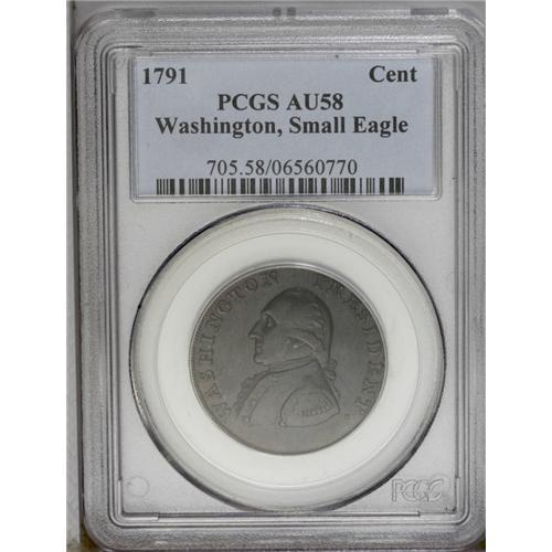 <B>1791<1C> Washington Small Eagle Cent AU58 PCGS.</B></I> Baker-16, R.3. The light rub visible on this Small Eagle cent suggests that it saw at least ephemeral use in commercial trade before being put up as a Washington memento. The distraction-free surfaces are glossy brown, with tinges of violet on Washington's highpoints. Listed on page 77 of the 2007 <I>Guide Book.</B></I>