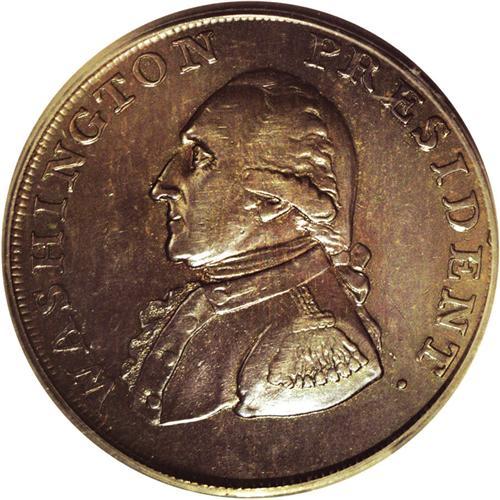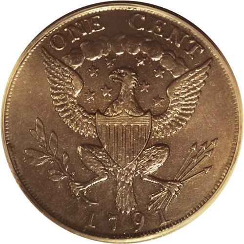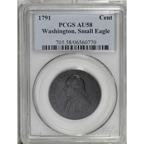 <B>1791<1C> Washington Small Eagle Cent AU58 PCGS.</B></I> Baker-16, R.3. A bold and attractive deep-brown representative. A trace of friction on Washington's hair near the temple determines the grade. A minor rim ding is on the reverse at 8 o'clock, and a pinscratch is beneath the ponytail. Listed on page 77 of the 2007 <I>Guide Book.</B></I>