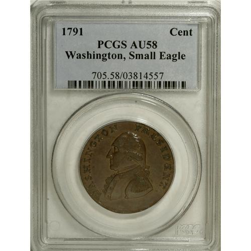 <B>1791 1C Washington Small Eagle Cent AU58 PCGS.</B></I> Baker-16, R.3. The mahogany-brown surfaces retain substantial mint gloss, although Washington's hair and epaulet show minor wear. The fields are smooth and pleasing. Listed on page 77 of the 2007 <I>Guide Book.</B></I><BR><BR><b>Shipping:</b> Coins & Currency (<a target="_blank" href="http://www.heritageauctions.com/common/shipping.php">view shipping information</a>)