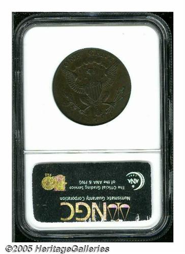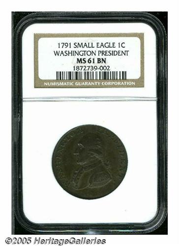 <B>1791<1C> Washington Small Eagle Cent MS61 Brown NGC.</B></I> Baker-16, R.3. D&H Middlesex-1050. Rich, mottled chocolate brown color. Some verdigris is seen especially in the arrowheads on the reverse, and a few light contact marks are noted under close inspection. Listed on page 65 of the 2005 <I>Guide Book.</B></I>