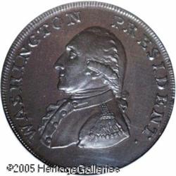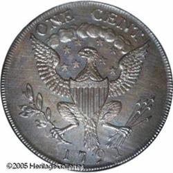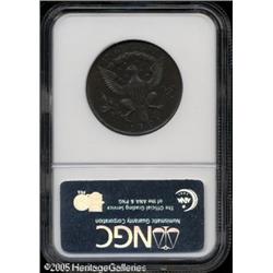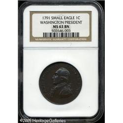 <B>1791 1C Washington Small Eagle Cent MS63 Brown NGC.</B></I> Baker-16, R.3. The Small Eagle Cent is one of the few Washington pieces that actually shows a denomination. Designed in England by John Gregory Hancock, these pieces were proposed as federal contract coinage. Upon seeing an example, Washington rejected the coin as "monarchial." However, many pieces were given out to Cabinet officials, senators, and representatives. Eventually, many of the 1500 pieces struck circulated as coinage. This well struck mahogany and tan-brown Cent has a few faint pinscratches in the field, but is free from contact marks. Listed on page 65 of the 2005 <I>Guide Book.</B></I> Lot:5054