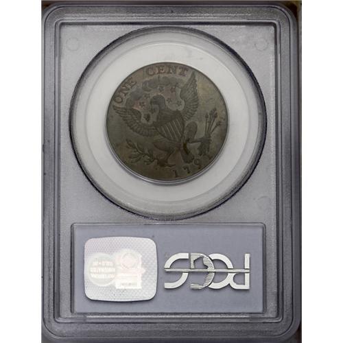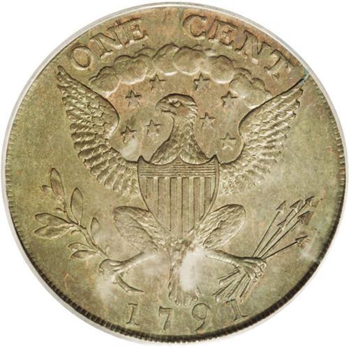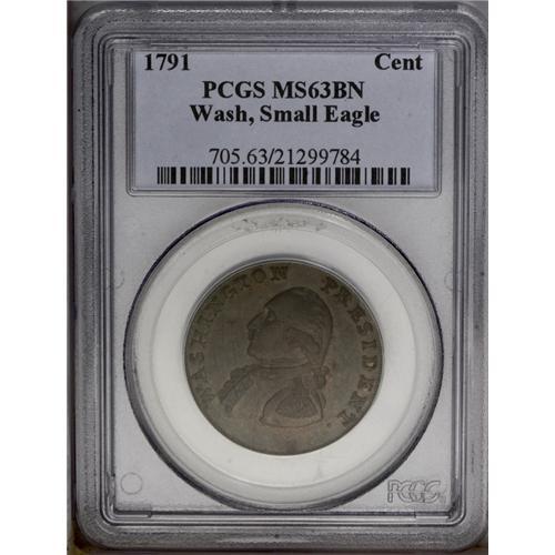 <B>1791<1C> Washington Small Eagle Cent MS63 Brown PCGS.</B></I> Baker-16, R.3. Glossy and nearly abrasion-free with a few glimpses of faded orange color about the devices. Close examination reveals a small cluster of ancient pinscratches in the field along Washington's brow and nose. The Small Eagle cent was designed in England by John Gregory Hancock as proposed federal contract coinage (hence the denomination.) Upon seeing the design, Washington allegedly rejected the coin as "monarchial." However, many pieces were given out to Cabinet officials, senators, and representatives. Eventually, many of the 1,500 pieces struck found their way into circulation. Listed on page 77 of the 2006 <I>Guide Book.</B></I> <BR><BR><B>Important notice:</B> Heritage usually auctions material at the rate of 200-250 lots per hour. On some occasions eBay Live bid software or the Internet may not be able to keep up with the pace of the auction. We recommend placing a realistic absentee bid now as insurance to avoid disappointment. Occasionally the auctioneer may eliminate or reject an eBay Live bid, and the auctioneer may also reopen a lot after the close of the eBay live bidding (usually because we missed an audience bid), and may reject your bid even if it shows you as the winning bidder. By bidding via eBay Live, you agree that Heritage may award the lot to another bidder at its sole discretion under the circumstances described above or any other reasonable circumstances. Since eBay bids are not shown to us until we open the lot on the floor, we treat those bids just like floor bids. In most cases the floor responds before the eBay bid is presented to us, due to Internet lag time, so for consistency we have made it a policy that floor bids are always considered first over tie eBay live bids. Also please note that all Heritage lots purchased through eBay Live carry a 20% Buyer's Premium. Please make sure you read the Terms and Conditions before you bid. This lot is being auctioned in conjunction with a live floor auction by Heritage Galleries & Auctioneers. All final auction and invoice information will be supplied by Heritage Galleries & Auctioneers, and all other information should be considered preliminary. Lot:192 <BR><BR><B>Winning Notification and Billing:</B> After the FINAL session in this auction is complete, Heritage will send e-mail and snail mail invoices. This process normally takes several days. All final auction and invoice information will be supplied by Heritage Galleries & Auctioneers, and all other information should be considered preliminary. <BR><BR>This auction will be conducted on a live auction floor and over the Internet through eBay Live. If you choose to place an absentee bid, please take a moment to <font color='#0000ff'><u><a href='http://pages.ebay.com/liveauctions/help/before/laabsentee.html'>learn how eBay Live absentee bidding works</a></u></font><font color='#000000'>