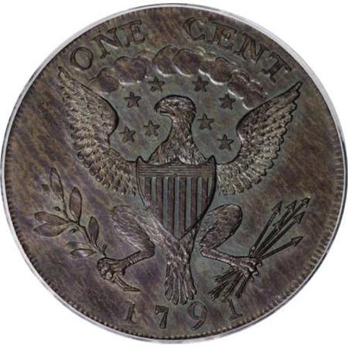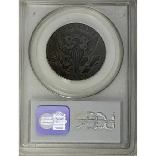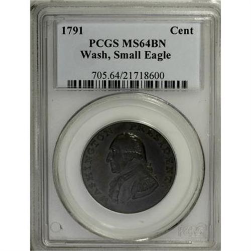<B>1791 1C Washington Small Eagle Cent MS64 Brown PCGS.</B></I> Baker-16. An exactingly struck and moderately prooflike near-Gem whose mahogany surfaces exhibit sea-green and cobalt-blue undertones. Smooth aside from a brief thin mark beneath Washington's shoulder. Listed on page 77 of the 2008 <I>Guide Book</B></I>. Population: 19 in 64 Brown, 10 finer (1/08).<BR><BR><b>Shipping:</b> Coins & Currency (<a target="_blank" href="http://www.heritageauctions.com/common/shipping.php">view shipping information</a>)