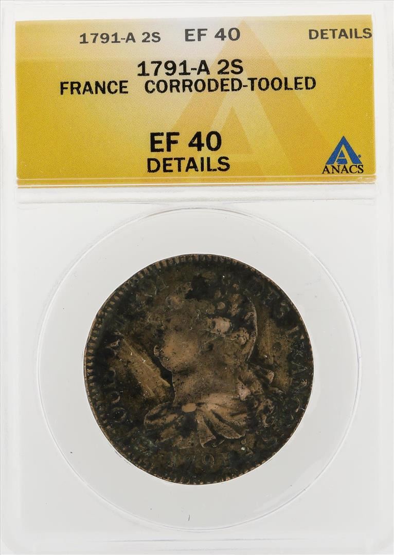 One 1791-A 2 Sols France Corroded Tooled Coin ANACS EF40 Details. ANACS Certified.