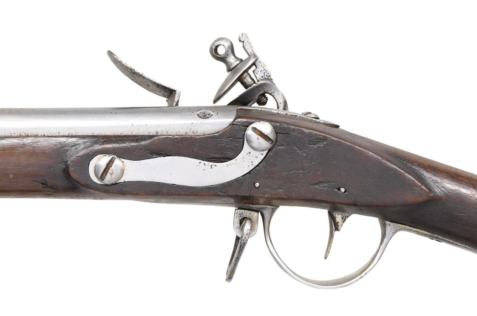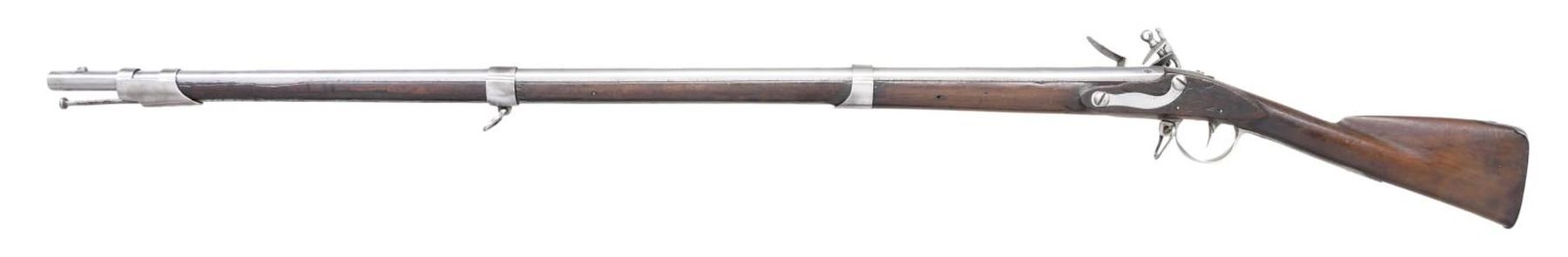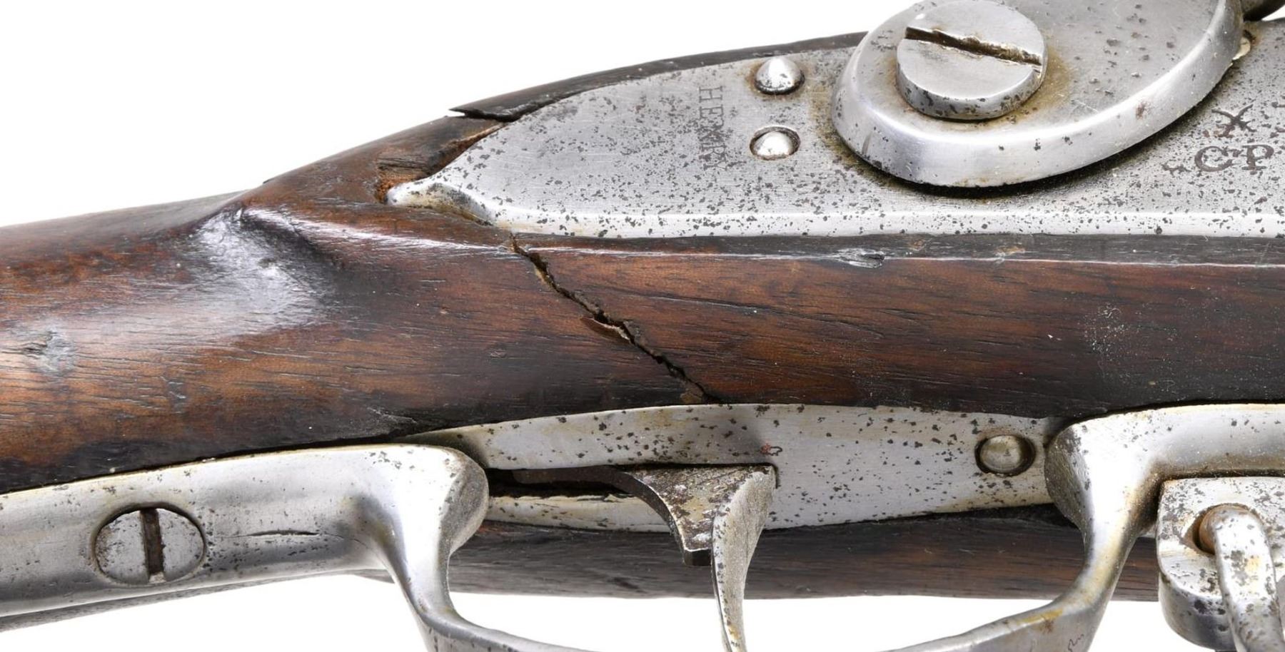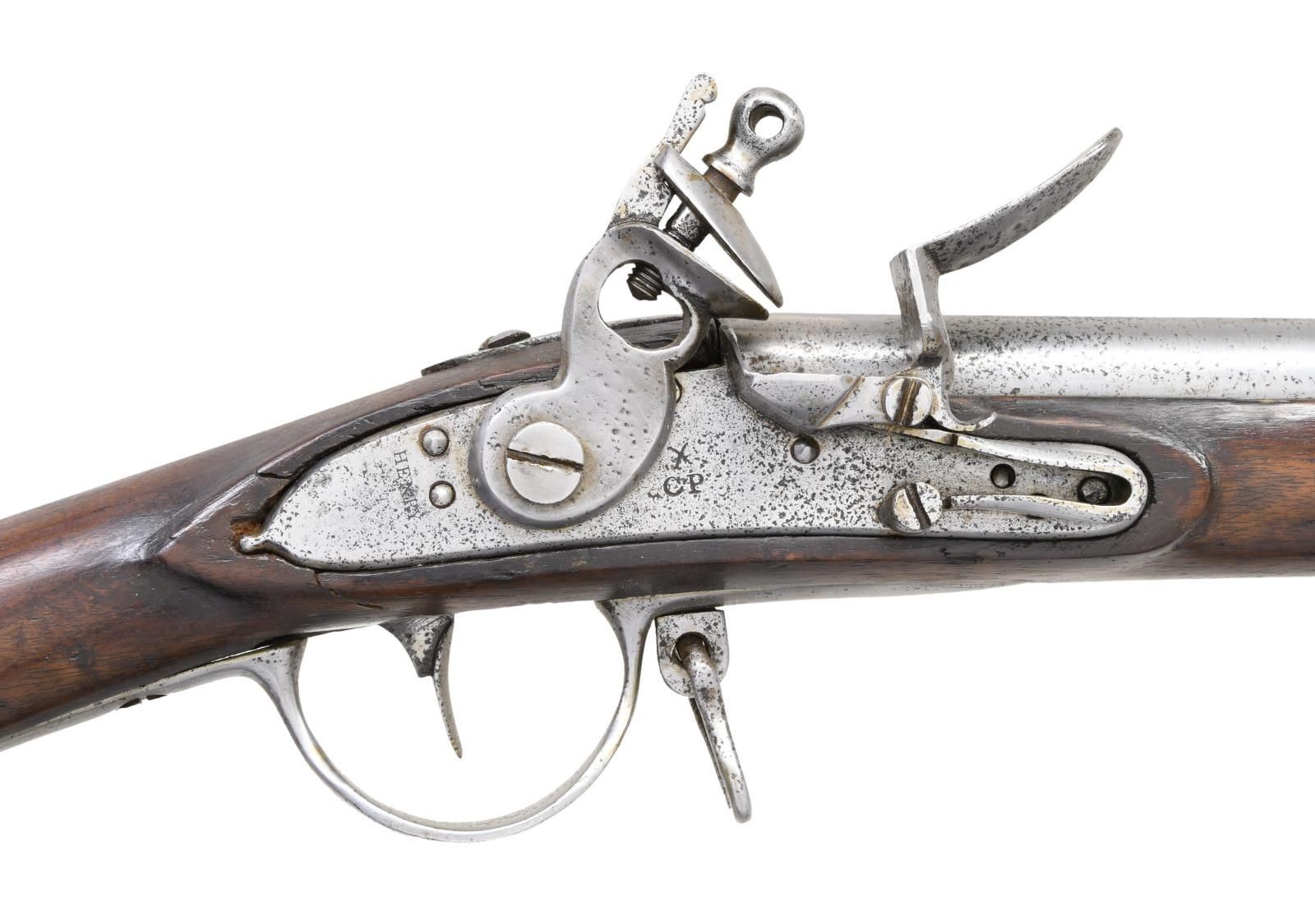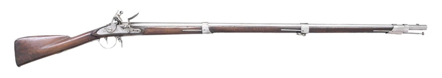FLINTLOCK MUSKET. Cal. .69 caliber. NSN. 59.5" overall. 44" round barrel with indiscernible sunken oval proof. According to author Milton Von Damm: "This is a military musket that was part of a Henry and Graeff contract for 2,000 flintlock muskets for the Pennsylvania militia. It has a forty inch barrel of .69 caliber with three bands to attach the barrel to the stock. The lock has an integrated pan and is marked HENRY behind the cock and CP in front of it. there has been major wood replaced in front of the back band. A sunken cartouche on the barrel has been filed, but probably was a Phrygian cap over a P that symbolized freedom. HISTORICAL IMPORTANCE: Both Abraham (Lancaster) and his brother William (Nazareth) had independent contracts in 1797. The muskets made by Abraham are much more rare. According to George Moller, Vol. 2, page 256, their marks were different and this musket conforms to Abraham's marks. The muskets made by Abraham were marked HENRY on the lock tail and Williams muskets were marked W. HENRY." CONDITION: good to very good overall. Forestock is stapled underneath band. Strong mechanics. Dirty, clear bore. PROVENANCE: Mike D'Ambra July, 1999; Lifelong Collection of author Milton Von Damm. (01-24792/JS). ANTIQUE. $2,000-3,000.