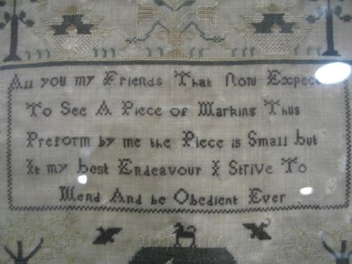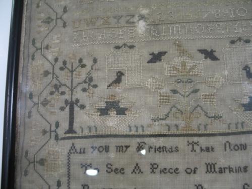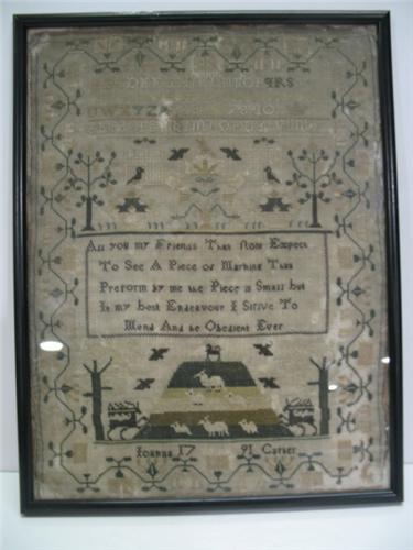 1791 NEEDLEPOINT ALPHABET SAMPLER. Elaborately decorated with birds, stags, and sheep. Signed at bottom by maker “Joanna Carver, 1791”. Sampler is extremely faded and shows loss at bottom right. 13.75” x 18” framed.
