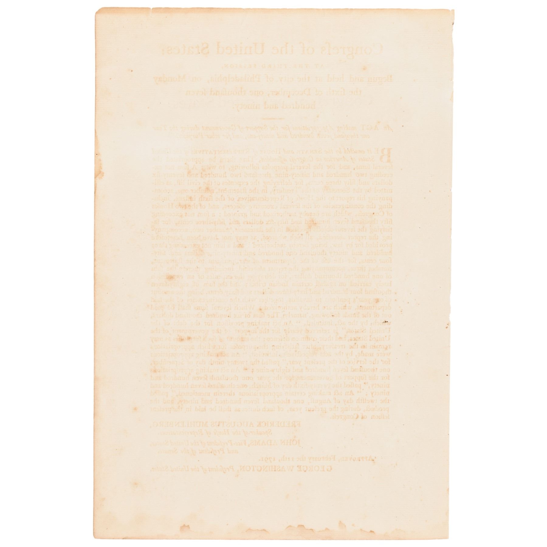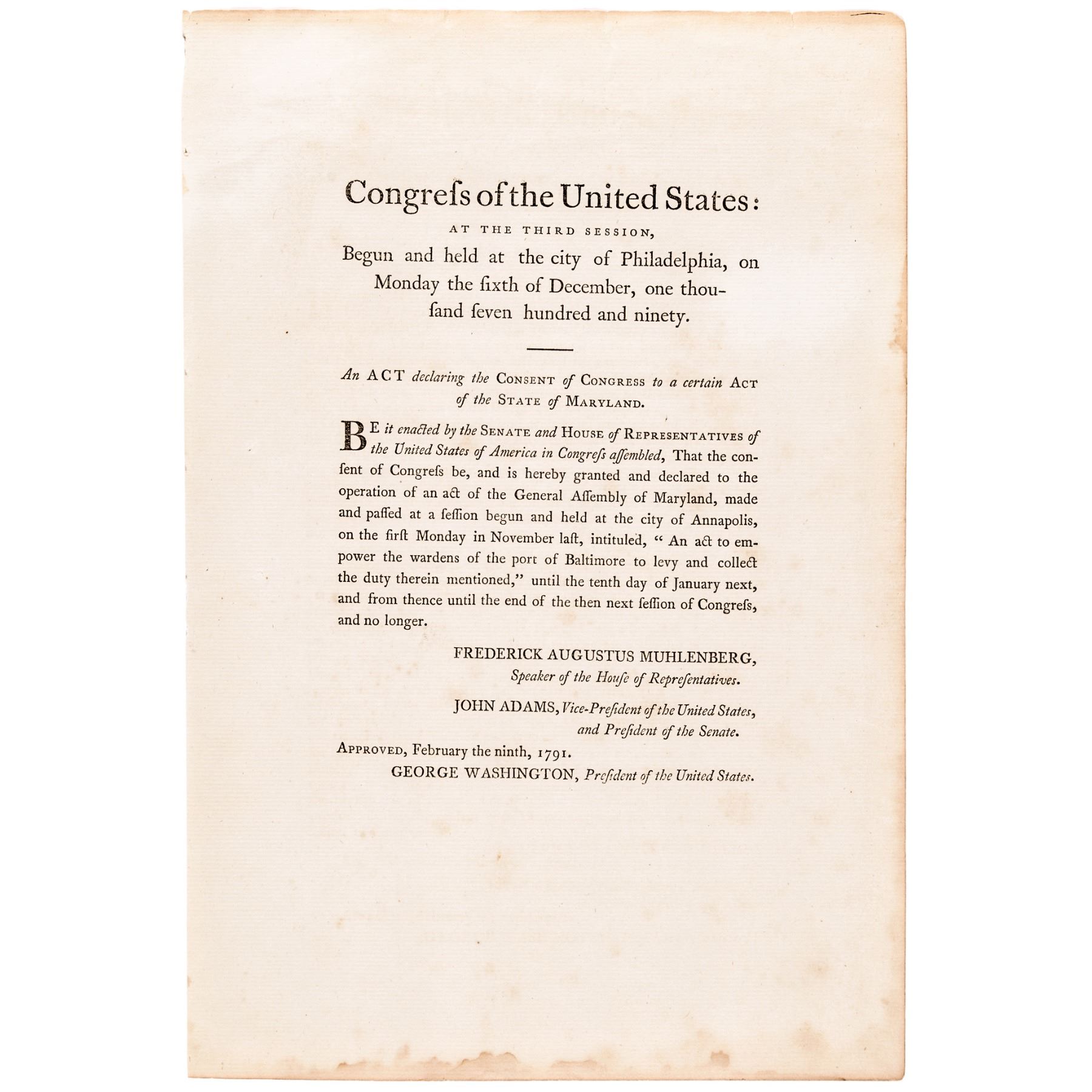 Original Printing of an early Port of Baltimore Federal ACT, Document measuring 7.5” x 11.25”, 1 page, at Philadelphia. Some faint damp tone along the bottom edge, overall sharply printed in rich black ink on laid period paper. This Document reads, in part: “Congress of the United States: at the Third Session, Begun and held at the city of Philadelphia, on Monday the sixth of December, one thousand seven hundred and ninety. - An ACT declaring the Consent of Congress to a certain ACT of the State of Maryland. - An act to empower the wardens of the port of Baltimore to levy and collect the duty therein mentioned. - Approved, February the ninth, 1791. - (Signed in Print) George Washington, President of the United States.”