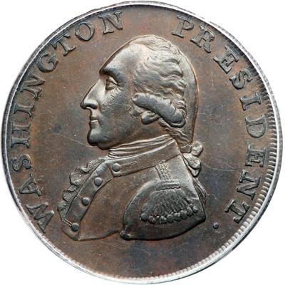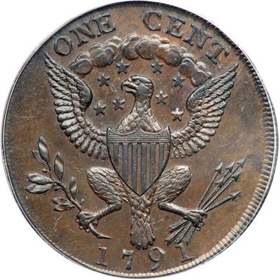 1791 Washington Cent with Small Eagle Reverse Breen-1217. PCGS graded MS-63 Brown. Choice glossy chocolate brown blending into a slightly lighter shade of steel brown in the protected areas. Great luster and eye appeal. The only marks are a few microscopic hairlines in the obverse fields. Pop 13; 29 finer, 19 in 64, 6 in 65, 4 in 66.