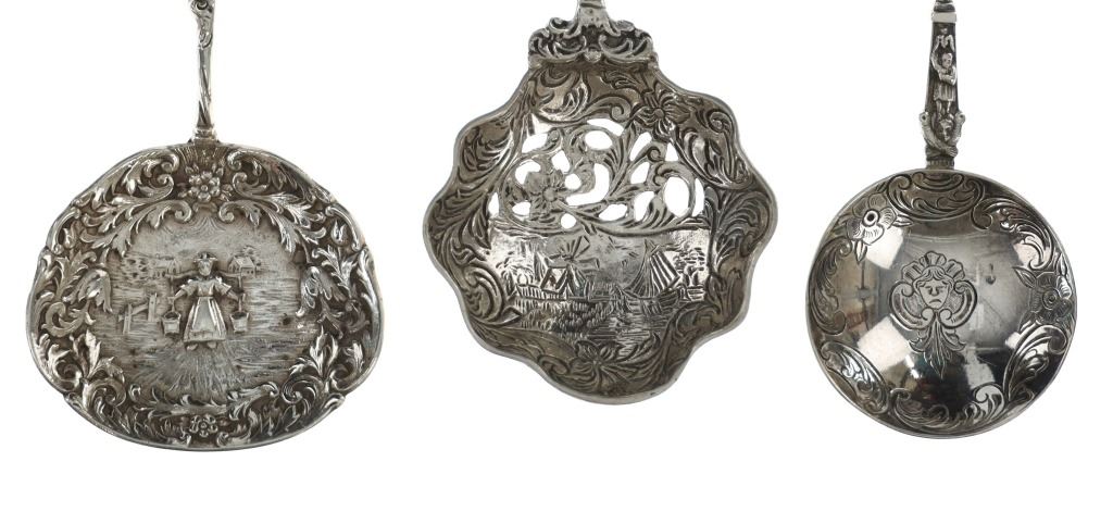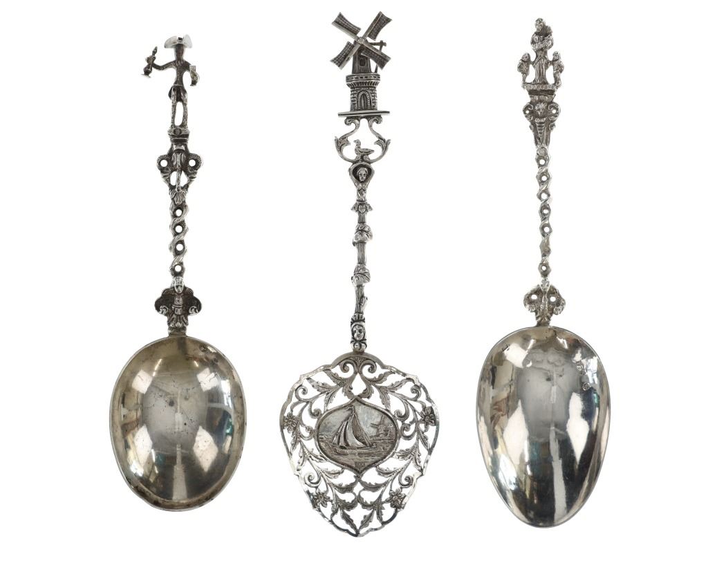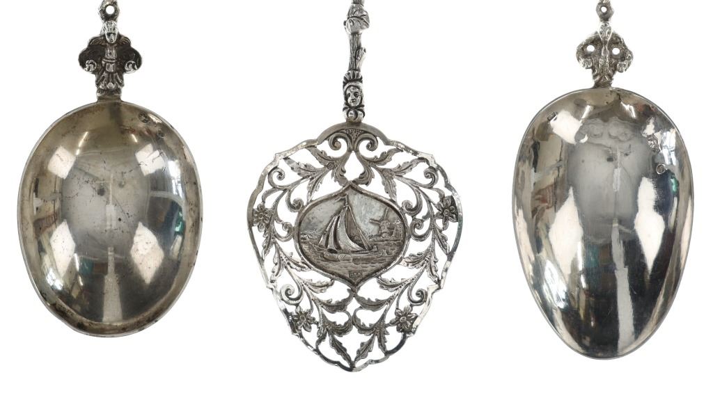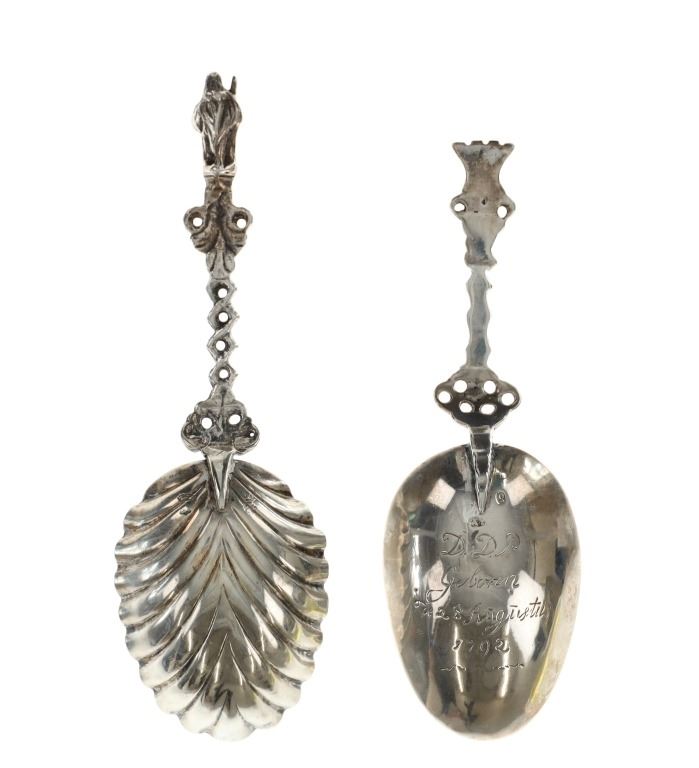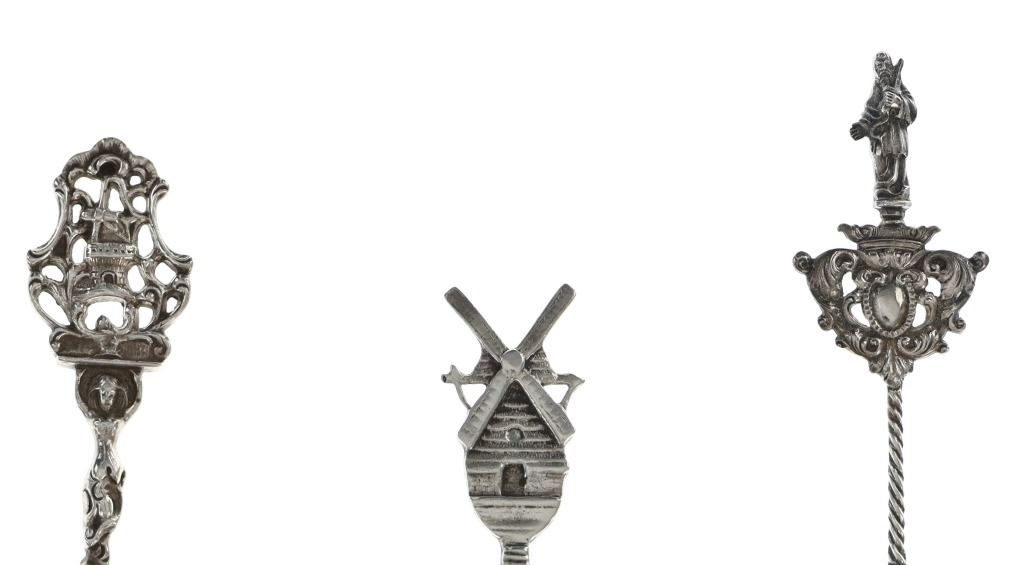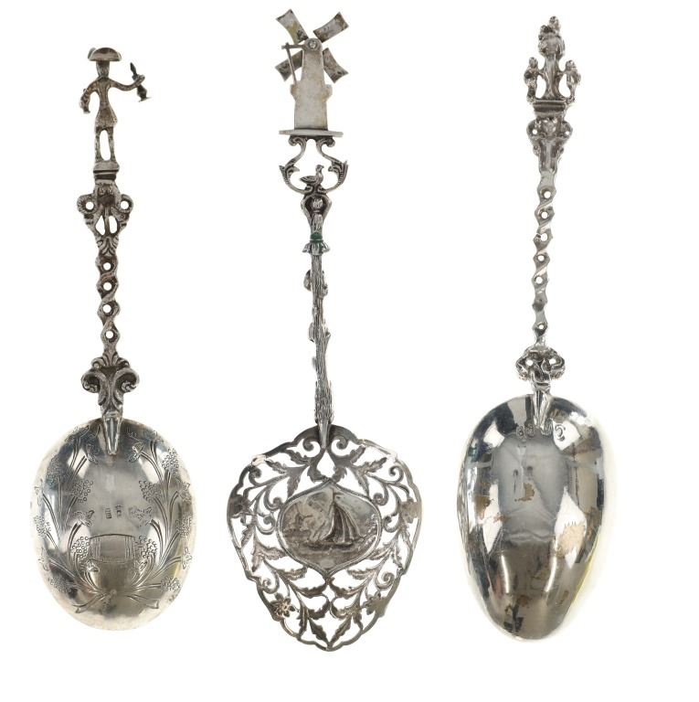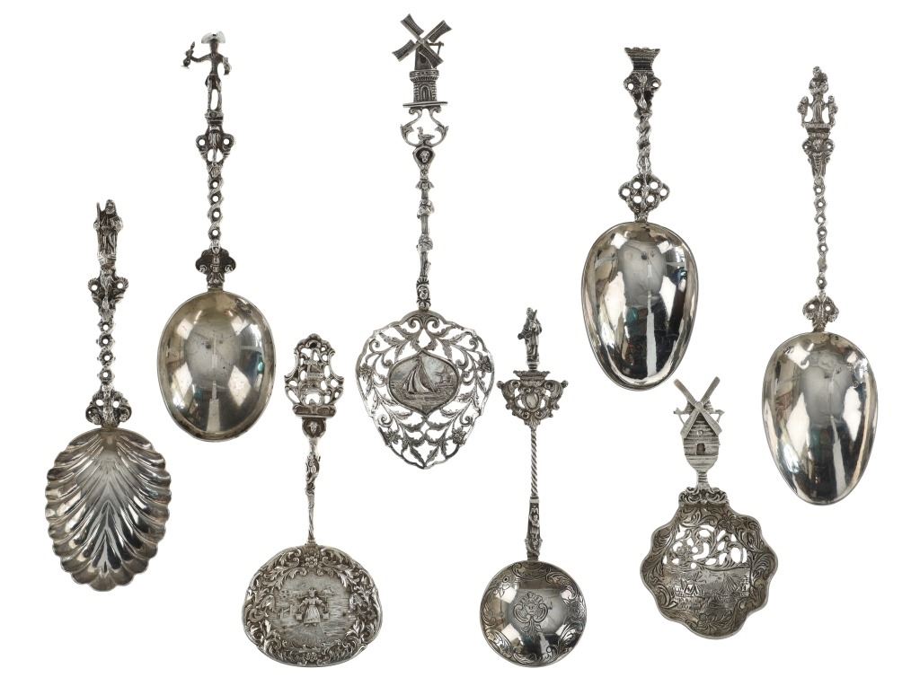 Featured in this lot are eight highly decorative sterling spoons from Holland and the United States circa 1792-1930. The first spoon in this collection shows Holland stamps and was made circa 1792. The spoon shows a detailed neck and top piece, while the back of the bowl reads, "D. D. P. Geboren 28 Augustus 1792". The spoon shows the makers mark reading, "A Y" and another stamp showing a crown over an "O". The second spoon in this collection was made by a Dutch silversmith and is marked in the bowl reading "FA" or "TA". The spoon is intricately designed and shows cut out floral designs in the bowl of the spoon. The neck is finely crafted with look like a log and shows leaves throughout. At the top of the neck it shows a woman and a large windmill with spinning wings. The image in the bowl shows a farm and windmill in the background while the foreground shows a sailing boat. The third spoon in this lot was made by a Dutch silversmith as well and shows Dutch stampings on the back of the bowl. The makers mark is not present and the other stampings have been worn down significantly. The bowl of the spoon shows a leaf like design and an intricately designed neck featuring a man standing at the top holding a walking stick. The fourth spoon in this collection shows Dutch markings as well. The spoon shows the letter "b" stamped inside the bowl indicating it was made in the year 1886, while next to it, it is stamped with a lion with a "2" under it indicating that this was .833 sterling. The back of the bowl shows another stamp reading "H 13". The back of the bowl features intricately stamped floral designs. The neck shows a partial twist towards the bottom and features a man wearing a large hat as the top piece. The fifth spoon in this collection was made in Holland circa 1890-1912. The spoon shows two marks indicating the year it was made, a small old style letter "f" indicating it was made in 1890, as well as a large "C" indicating it was made in 1912. The inside of the bowl shows another stamp of a lion and a key with the number "2" below it indicating that this is made of .833 sterling. The back of the bowl shows other unrecognizable stamps. The neck of the spoon shows punched holes and an intricately designed top piece of a woman and her three children. The sixth spoon featured in this lot was made in Holland circa 1817. The spoon features an elegant look with beautiful designs throughout the bowl, neck and top piece. The bowl shows a womans face in the center with floral designs around the outer edge of the bowl. The bottom of the neck features two faces while the middle of the neck features a twist of sterling. The top piece shows a man holding a small sword in his hand as he stands atop a highly decorated crown. The back of the bowl features three stamps, two being unrecognizable and the third showing the letter "H" indicating it was made in 1817. The seventh spoon in this collection was made by Marshall Field & Company in Chicago, Illinois circa 1905-1930s. The historic department store Marshall Field & Company, also known as Marshall Field's, was located in Chicago, Illinois. The beginning of Marshall Field's can be traced to a dry goods store that Potter Palmer established in 1852. Marshall Field joined Palmer in partnership after moving to Chicago in 1856 and working for a number of Palmer's rivals. Field purchased Leiter's shares and changed the company's name to Marshall Field & Co. Field built a wholesale store on Franklin Street to house his ongoing expansion, selling bulk supplies to small businesses across the central and western United States. In 1901, Marshall Field & Company was founded. In 1902, a twelve-story building on State Street debuted, and in 1906, a second brand-new structure on Wabash Avenue did the same. 1904 saw the opening of Marshall Field's fully outfitted Marshall Field & Co. Craft Shop and Metal Foundry. They produced items that were both handcrafted and manufactured by machines in an effort to profit from the arts and crafts movement. The store remained open and produced Arts & Crafts flatware, hollowware porringers, bracelets, hatpins, brooches, candy dishes, and other jewelry until 1950. The spoon shows the makers mark on the back of the top piece reading, "Marshall, Field & Co. Sterling 7042". The spoon shows no other marks. The spoon bowl features a highly detailed image of a woman carrying buckets to her farm house, while the outer edges of the bowl are full of floral designs. The neck is highly detailed and features a woman holding up a partial mill as the top piece. The eighth and final spoon in this collection can not be identified to a region or time period but features a sterling construction. The spoon is the smallest of the collection but features a deep bowl lined with intricate floral designs and a farm scene with a windmill. The neck of the spoon is an old windmill. The back of the neck is stamped "2 Sterling". The spoons show good condition overall with little signs of wear and no signs of obvious damage. The spoons measure from 4 7/16" L x 2 5/16" W to 7 3/4" L x 2 5/16" W. The collective weight of all the spoons is 343 grams.