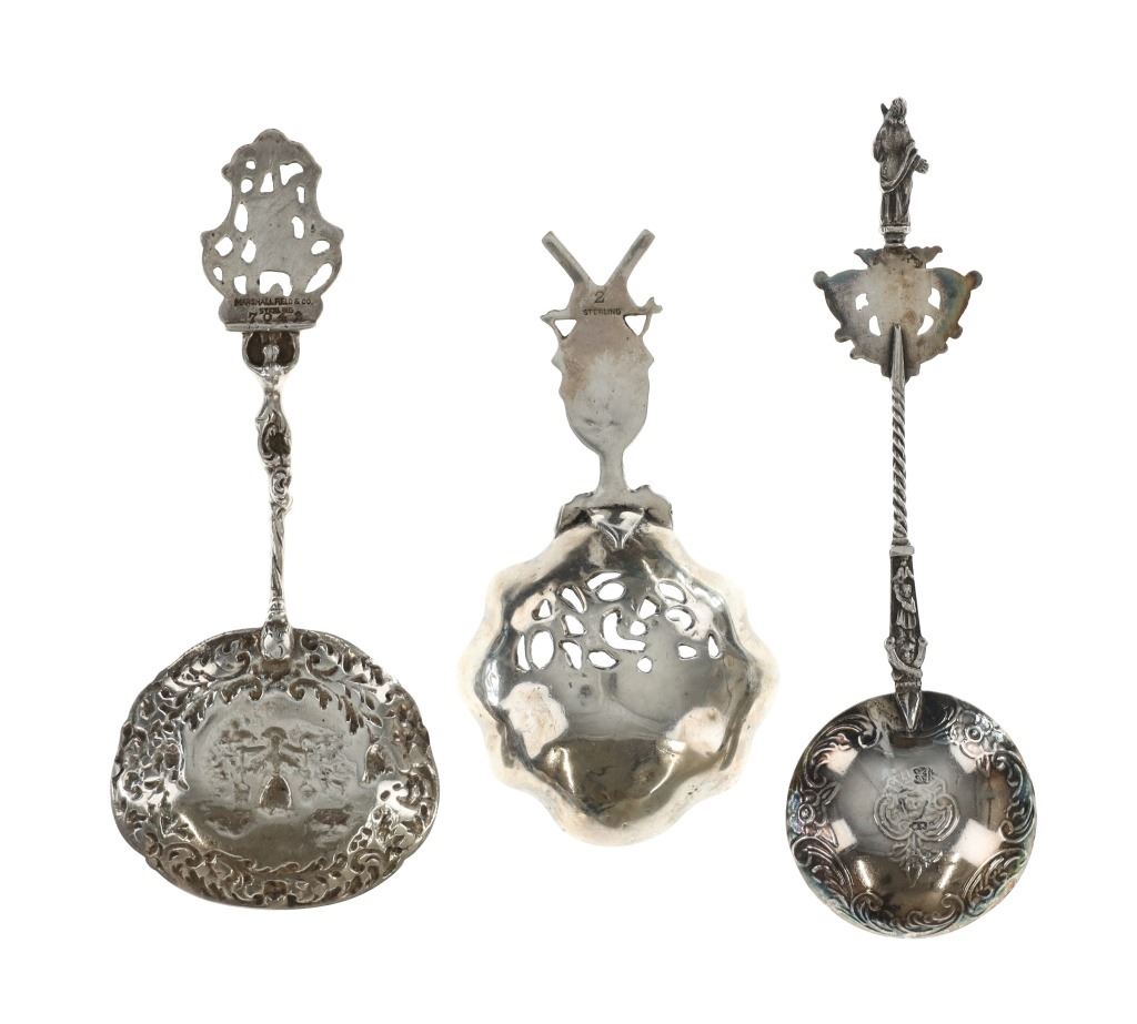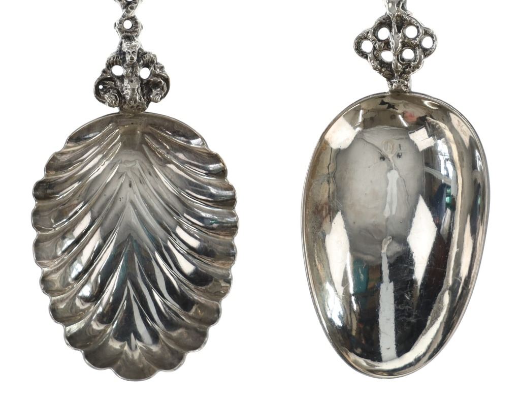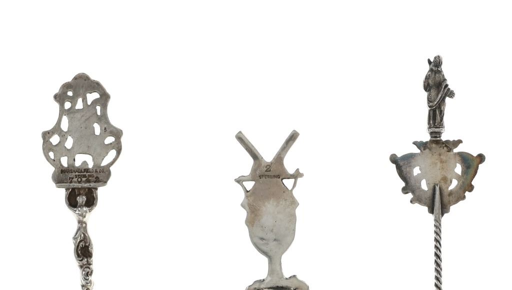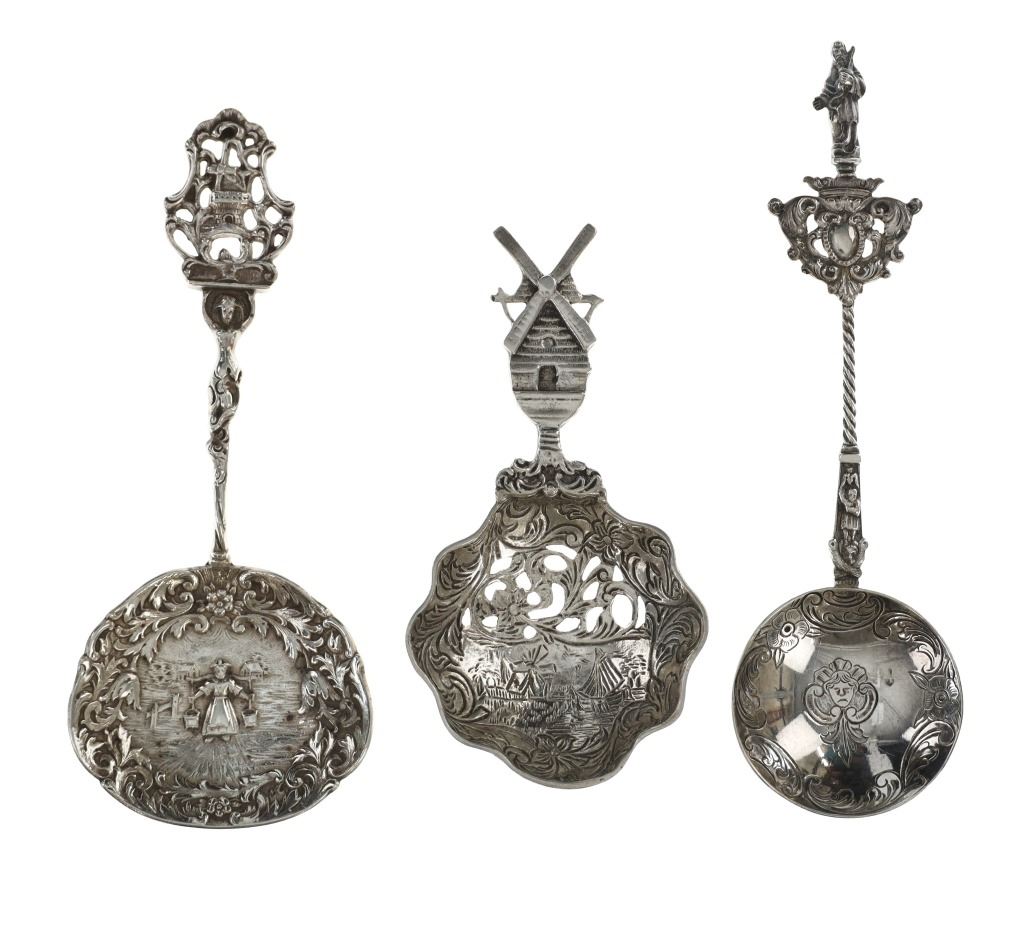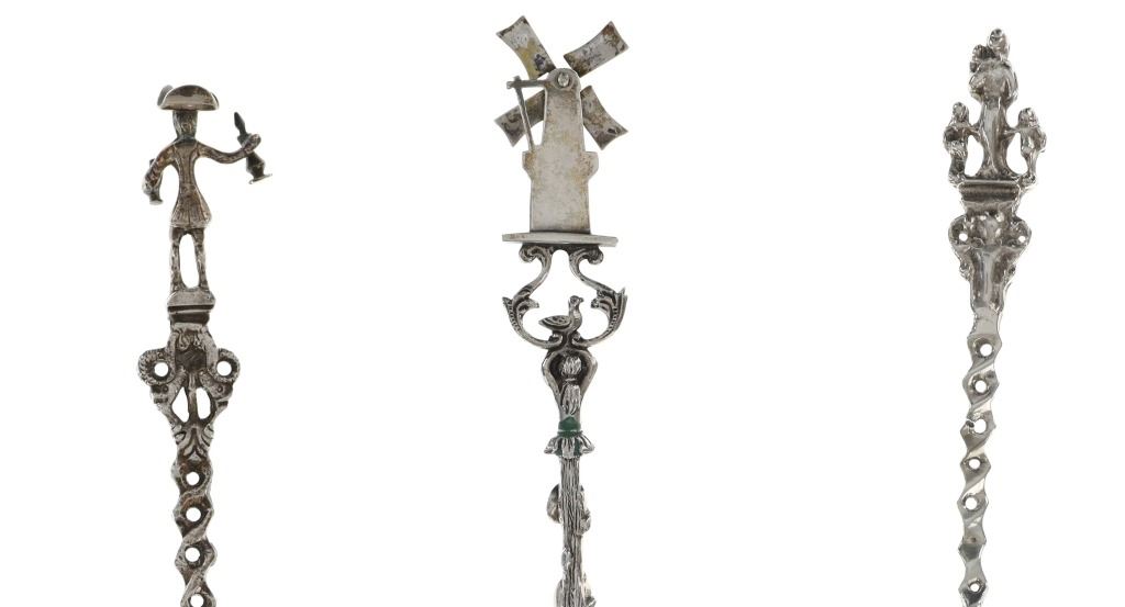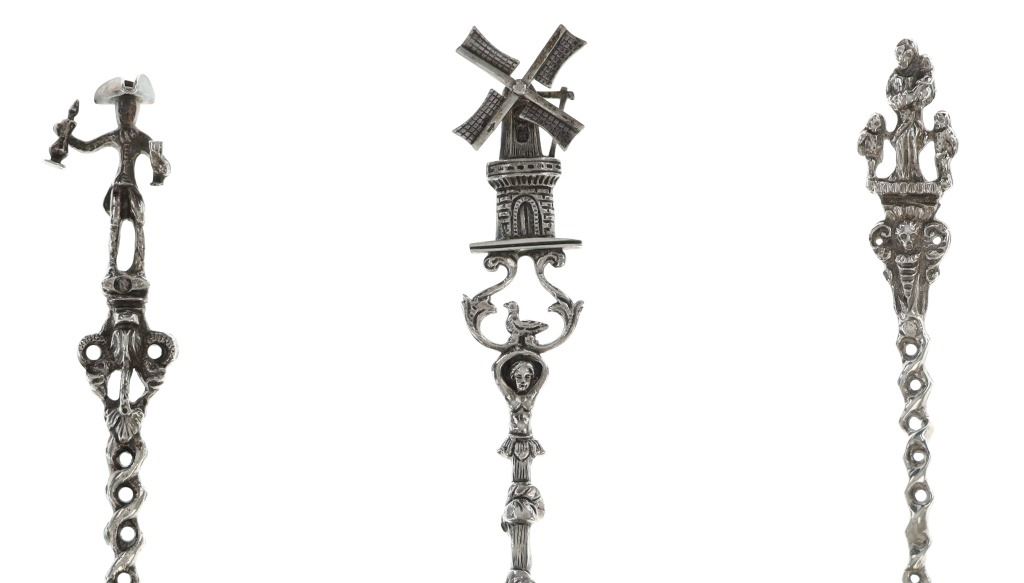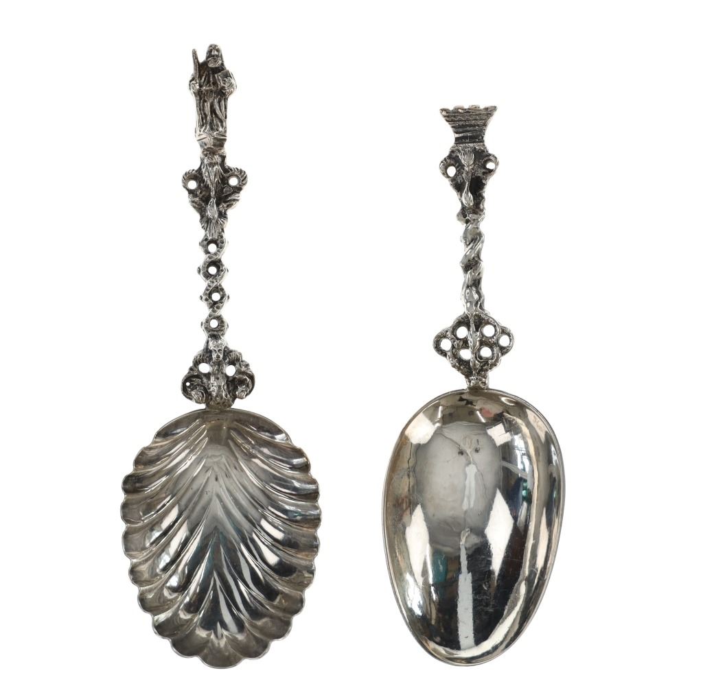 Featured in this lot are eight highly decorative sterling spoons from Holland and the United States circa 1792-1930. The first spoon in this collection shows Holland stamps and was made circa 1792. The spoon shows a detailed neck and top piece, while the back of the bowl reads, "D. D. P. Geboren 28 Augustus 1792". The spoon shows the makers mark reading, "A Y" and another stamp showing a crown over an "O". The second spoon in this collection was made by a Dutch silversmith and is marked in the bowl reading "FA" or "TA". The spoon is intricately designed and shows cut out floral designs in the bowl of the spoon. The neck is finely crafted with look like a log and shows leaves throughout. At the top of the neck it shows a woman and a large windmill with spinning wings. The image in the bowl shows a farm and windmill in the background while the foreground shows a sailing boat. The third spoon in this lot was made by a Dutch silversmith as well and shows Dutch stampings on the back of the bowl. The makers mark is not present and the other stampings have been worn down significantly. The bowl of the spoon shows a leaf like design and an intricately designed neck featuring a man standing at the top holding a walking stick. The fourth spoon in this collection shows Dutch markings as well. The spoon shows the letter "b" stamped inside the bowl indicating it was made in the year 1886, while next to it, it is stamped with a lion with a "2" under it indicating that this was .833 sterling. The back of the bowl shows another stamp reading "H 13". The back of the bowl features intricately stamped floral designs. The neck shows a partial twist towards the bottom and features a man wearing a large hat as the top piece. The fifth spoon in this collection was made in Holland circa 1890-1912. The spoon shows two marks indicating the year it was made, a small old style letter "f" indicating it was made in 1890, as well as a large "C" indicating it was made in 1912. The inside of the bowl shows another stamp of a lion and a key with the number "2" below it indicating that this is made of .833 sterling. The back of the bowl shows other unrecognizable stamps. The neck of the spoon shows punched holes and an intricately designed top piece of a woman and her three children. The sixth spoon featured in this lot was made in Holland circa 1817. The spoon features an elegant look with beautiful designs throughout the bowl, neck and top piece. The bowl shows a womans face in the center with floral designs around the outer edge of the bowl. The bottom of the neck features two faces while the middle of the neck features a twist of sterling. The top piece shows a man holding a small sword in his hand as he stands atop a highly decorated crown. The back of the bowl features three stamps, two being unrecognizable and the third showing the letter "H" indicating it was made in 1817. The seventh spoon in this collection was made by Marshall Field & Company in Chicago, Illinois circa 1905-1930s. The historic department store Marshall Field & Company, also known as Marshall Field's, was located in Chicago, Illinois. The beginning of Marshall Field's can be traced to a dry goods store that Potter Palmer established in 1852. Marshall Field joined Palmer in partnership after moving to Chicago in 1856 and working for a number of Palmer's rivals. Field purchased Leiter's shares and changed the company's name to Marshall Field & Co. Field built a wholesale store on Franklin Street to house his ongoing expansion, selling bulk supplies to small businesses across the central and western United States. In 1901, Marshall Field & Company was founded. In 1902, a twelve-story building on State Street debuted, and in 1906, a second brand-new structure on Wabash Avenue did the same. 1904 saw the opening of Marshall Field's fully outfitted Marshall Field & Co. Craft Shop and Metal Foundry. They produced items that were both handcrafted and manufactured by machines in an effort to profit from the arts and crafts movement. The store remained open and produced Arts & Crafts flatware, hollowware porringers, bracelets, hatpins, brooches, candy dishes, and other jewelry until 1950. The spoon shows the makers mark on the back of the top piece reading, "Marshall, Field & Co. Sterling 7042". The spoon shows no other marks. The spoon bowl features a highly detailed image of a woman carrying buckets to her farm house, while the outer edges of the bowl are full of floral designs. The neck is highly detailed and features a woman holding up a partial mill as the top piece. The eighth and final spoon in this collection can not be identified to a region or time period but features a sterling construction. The spoon is the smallest of the collection but features a deep bowl lined with intricate floral designs and a farm scene with a windmill. The neck of the spoon is an old windmill. The back of the neck is stamped "2 Sterling". The spoons show good condition overall with little signs of wear and no signs of obvious damage. The spoons measure from 4 7/16" L x 2 5/16" W to 7 3/4" L x 2 5/16" W. The collective weight of all the spoons is 343 grams.