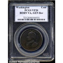 1792 1C Washington Born Virginia Cent, Inscribed Reverse VF20 PCGS. Baker-60, R.6. The reverse center of this rare Washington piece is typically struck, as is usually encountered due to its shallow relief when compared with the portrait. Both sides have a few faint handling marks in the fields. The dies are slightly rotated clockwise. Listed on page 60 of the 2003 Guide Book. Important notice: Heritage usually auctions material at the rate of 200-250 lots per hour. On some occasions eBay Live bid software or the Internet may not be able to keep up with the pace of the auction. We recommend placing a realistic absentee bid now as insurance to avoid disappointment. Occasionally the auctioneer may eliminate or reject an eBay Live bid, and the auctioneer may also reopen a lot after the close of the eBay live bidding (usually because we missed an audience bid), and may reject your bid even if it shows you as the winning bidder. By bidding via eBay Live, you agree that Heritage may award the lot to another bidder at its sole discretion under the circumstances described above or any other reasonable circumstances. Also please note that all Heritage lots purchased through eBay Live carry a 20% Buyer's Premium. Please make sure you read the Terms and Conditions before you bid.