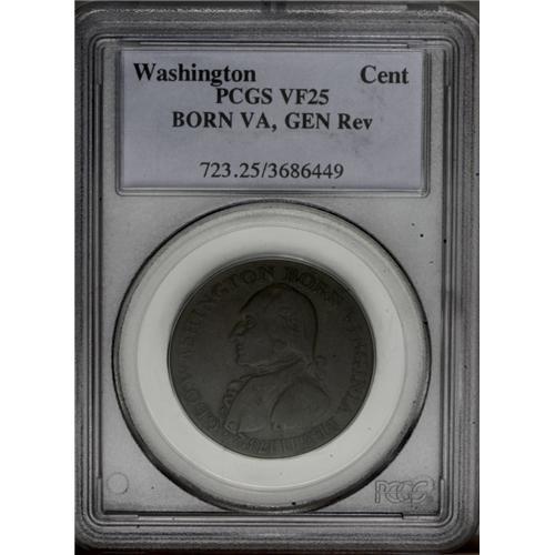 <B>1792<1C> Washington Born Virginia Cent, Inscribed Reverse VF25 PCGS.</B></I> Breen-1239, Baker-60. This is the "second die" as outlined by Walter Breen, and it is the more plentiful of two varieties, being attributable by the placement of the 1 in 1789 (actually a capital I was used in place of a digit) below the right base of the T. While moderately worn, this example boasts a conspicuous absence of problems and shows only the normal weakness at the center of the reverse. Listed on page 78 of the 2006 <I>Guide Book.</B></I><BR><I>From The Steve Glenn Collection.</B></I> <BR><BR><B>Important notice:</B> Heritage usually auctions material at the rate of 200-250 lots per hour. On some occasions eBay Live bid software or the Internet may not be able to keep up with the pace of the auction. We recommend placing a realistic absentee bid now as insurance to avoid disappointment. Occasionally the auctioneer may eliminate or reject an eBay Live bid, and the auctioneer may also reopen a lot after the close of the eBay live bidding (usually because we missed an audience bid), and may reject your bid even if it shows you as the winning bidder. By bidding via eBay Live, you agree that Heritage may award the lot to another bidder at its sole discretion under the circumstances described above or any other reasonable circumstances. Since eBay bids are not shown to us until we open the lot on the floor, we treat those bids just like floor bids. In most cases the floor responds before the eBay bid is presented to us, due to Internet lag time, so for consistency we have made it a policy that floor bids are always considered first over tie eBay live bids. Also please note that all Heritage lots purchased through eBay Live carry a 20% Buyer's Premium. Please make sure you read the Terms and Conditions before you bid. This lot is being auctioned in conjunction with a live floor auction by Heritage Galleries & Auctioneers. All final auction and invoice information will be supplied by Heritage Galleries & Auctioneers, and all other information should be considered preliminary. Lot:193 <BR><BR><B>Winning Notification and Billing:</B> After the FINAL session in this auction is complete, Heritage will send e-mail and snail mail invoices. This process normally takes several days. All final auction and invoice information will be supplied by Heritage Galleries & Auctioneers, and all other information should be considered preliminary. <BR><BR>This auction will be conducted on a live auction floor and over the Internet through eBay Live. If you choose to place an absentee bid, please take a moment to <font color='#0000ff'><u><a href='http://pages.ebay.com/liveauctions/help/before/laabsentee.html'>learn how eBay Live absentee bidding works</a></u></font><font color='#000000'>