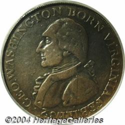<B>1792<1C> Washington Born Virginia Cent, Inscribed Reverse VF20 PCGS.</B></I> Baker-60, R.6. The reverse center of this rare Washington piece is typically struck, as is usually encountered due to its shallow relief when compared with the portrait. Both sides have a few faint handling marks in the fields. The dies are slightly rotated clockwise. Listed on page 60 of the 2004 <I>Guide Book.</B></I> <BR><BR><B>Important notice:</B> Heritage usually auctions material at the rate of 200-250 lots per hour. On some occasions eBay Live bid software or the Internet may not be able to keep up with the pace of the auction. We recommend placing a realistic absentee bid now as insurance to avoid disappointment. Occasionally the auctioneer may eliminate or reject an eBay Live bid, and the auctioneer may also reopen a lot after the close of the eBay live bidding (usually because we missed an audience bid), and may reject your bid even if it shows you as the winning bidder. By bidding via eBay Live, you agree that Heritage may award the lot to another bidder at its sole discretion under the circumstances described above or any other reasonable circumstances. Since eBay bids are not shown to us until we open the lot on the floor, we treat those bids just like floor bids. In most cases the floor responds before the eBay bid is presented to us, due to Internet lag time, so for consistency we have made it a policy that floor bids are always considered first over tie eBay live bids. Also please note that all Heritage lots purchased through eBay Live carry a 20% Buyer's Premium. Please make sure you read the Terms and Conditions before you bid. </span></font></tr></table></td></tr></table>