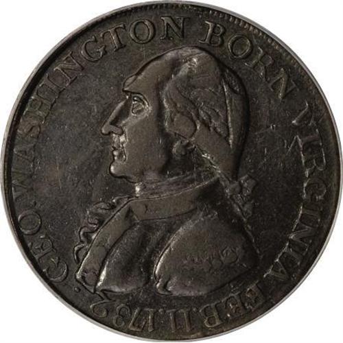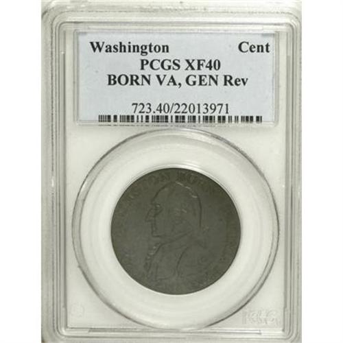 <B>Washington Born Virginia Cent, Inscribed Reverse XF40 PCGS.</B></I> Baker-60, R.6. Breen-1239. Copper. This rare variety is part of a series of copper Washington pieces struck between 1791 and 1792 by the Westwood Mint in Birmingham, England. The 1791 issues were private patterns for Federal coinage, the latter issues were simply produced for export and circulation in the United States. There are two die varieties of the Born Virginia, Inscribed Reverse. The first (Breen-1238) is extremely rare, and has the 1 in 1789 centered between the TE in UNITED. Breen-1239 is collectible, but rare in all grades, and usually found in VF. This mahogany-brown example is evenly struck and has the expected number of moderate field marks. Listed on page 78 of the 2006 <I>Guide Book.</B></I> Population: 2 in 40, 6 finer (10/07).<BR><BR><b>Shipping:</b> Coins & Currency (<a target="_blank" href="http://www.heritageauctions.com/common/shipping.php">view shipping information</a>)