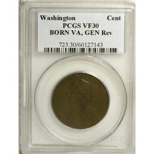 <B>1792 1C Washington Born Virginia Cent, Inscribed Reverse VF30 PCGS.</B></I> Baker-60, R.6. Even, deep brown patina covers each side. The center of the reverse is weakly defined from buckled dies, as usually seen. A very scarce Washington variety usually encountered in well-worn grades. The reverse border exhibits patches of fine abrasions, but there are no other relevant defects. Listed on page 78 of the 2008 <I>Guide Book.<BR>Ex: Wesley Van Olden Collection of Colonial Coinage (Heritage, 9/2003), lot 5179.</B></I><BR><BR><b>Shipping:</b> Coins & Currency (<a target="_blank" href="http://www.heritageauctions.com/common/shipping.php">view shipping information</a>)