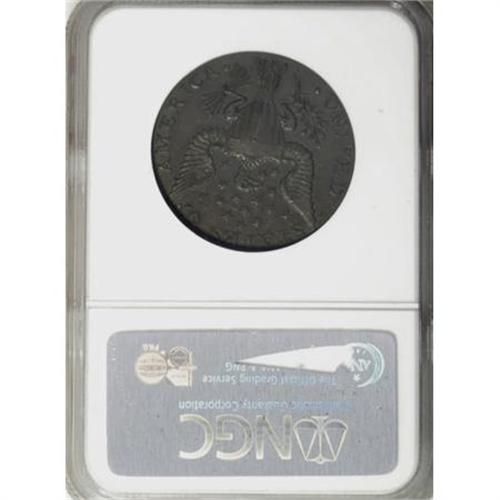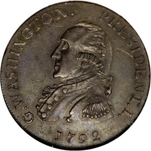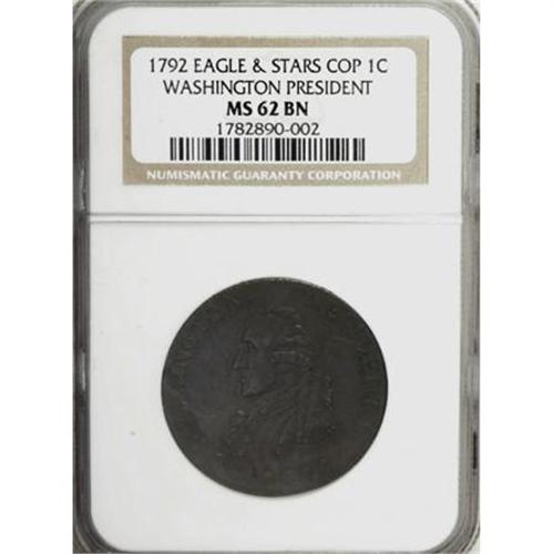 <B>1792 1C Washington Getz Pattern Cent, Small Eagle, Copper MS62 Brown NGC.</B></I> Baker-25, Breen-1352. Plain edge, medal turn. 32.0 mm, 260.8 gn per its Ford catalog appearance, which places it near the upper end of the 220 to 273 gn range specified in Rulau's modern revision of Baker. Rulau estimates, "about 30 pieces known," which is High R.6 by his scale.<BR> Baker-25 has been variously described as a large cent or half dollar pattern. Breen called it a cent, Rulau (in Baker) calls it a half dollar. The present piece was cataloged as a half dollar by Stack's, and as a cent by ANR. NGC has designated it as a cent. Getz omitted any indication of denomination, and only one pair of Small Eagle dies were used. Breen's division of the Getz patterns by denomination was based on their diameter. Large diameter silver pieces that show the denticles were listed as half dollars, while pieces struck on copper flans with a slightly smaller diameter that omit the dentils were classified as cent patterns. Most known examples have plain edges, but a few of both the copper and silver pieces have ornamental edges. Breen has suggested that these unusual edge designs were placed on the pieces after 1792, perhaps in 1800 for Washington's funeral processions (Breen-1357).<BR> The Federal Constitution passed in 1787, and the first Congress under the Constitution assembled in 1788. On Oct. 25, 1791, per Breen, President Washington "reminded the legislators that it was now up to them to enact laws implementing their earlier resolution to found a federal mint." Pennsylvania Senator and financier Robert Morris introduced such a bill on December 21, 1791. The bill evolved, and was passed by the Senate with the key language "Upon one side of each of the said coins there shall be all impression or representation of the head of the President of the United States for the time being, with an inscription which shall express the initial or first letter of his Christian or first name, and his surname at length, the succession of the presidency numerically, and the year of the coinage; and upon the reverse of each of the gold and silver coins there shall be the figure or representative of an eagle, with this inscription "United States of America," and upon the reverse of each of the copper coins, there shall be an inscription which shall express the denomination of the piece, namely, cent or half cent, as the case may require."<BR> Thus, the copper half cent and cent were to display their value on the coin, while the silver pieces would only imply the denomination by their weight. This supports Baker's classification of <I>all</B></I> the Getz pieces as half dollar patterns.<BR> Per Breen, Robert Morris wanted examples of the proposed coinage to help passage of his bill, and apparently conscripted silversmith Peter Getz of Lancaster, Pennsylvania. Morris was earlier responsible for the production of the extremely rare 1783 quints and marks, from a prior attempt at a national coinage. For the 1792 pieces, Getz based his design on John Gregory Hancock's Baker-16 1791 Small Eagle cent, since the devices matched the bill's specification of a head of Washington and an eagle. Baker-16 was made to secure a Federal coinage contract, and it was ironic that Getz would copy the design in his own attempt at securing Mint employment.<BR> All efforts by Morris and Getz were for naught, because the House of Representatives (and President Washington) opposed presidential portraits on coinage on the grounds they were too monarchial. Congress instead eventually enacted legislation on April 2, 1792, designating "an impression emblematic of liberty" as the obverse device.<BR> This well struck example is toned deep brown with subtle ice-blue undertones. The fields have a few faint abrasions likely present on the planchet prior to striking, aside from a single thin mark near the D in PRESIDENT.<BR> The present piece is the only Getz pattern certified by NGC. PCGS has certified 13 copper examples, with only one coin (an MS64) above the AU50 level. Although any Getz pattern is very rare, the appearance at auction of a Mint State example provides a major opportunity for the Washington collector. Listed on page 78 of the 2008 <I>Guide Book</B></I>.<BR><I>Ex: John J. Ford, Jr. Collection, Part II (Stack's, 5/04), lot 31; The Old West & Franklinton Collections (American Numismatic Rarities, 8/06), lot 12.<BR>From The Madison Collection.</B></I><BR><BR><b>Shipping:</b> Coins & Currency (<a target="_blank" href="http://www.heritageauctions.com/common/shipping.php">view shipping information</a>)