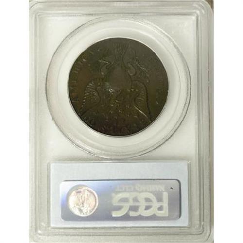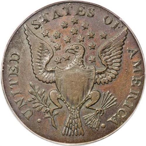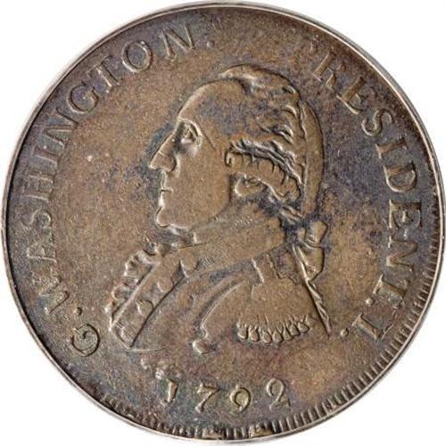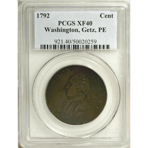 <B>1792 1C Washington Getz Pattern Cent, Small Eagle, Copper XF40 PCGS.</B></I> Baker-25. Breen-1352. 32 mm, plain edge. The dies for this well executed pattern Cent were engraved by Peter Getz of Lancaster, Pennsylvania. Getz based his designs on those of young Birmingham, England engraver John Gregory Hancock, specifically his 1791 Small Eagle cent (Baker-16). The reverse legend was changed from ONE CENT to UNITED STATES OF AMERICA, since silver strikings were intended, perhaps to serve as a half dollar, as suggested by Walter Breen. The reverse for this design replicates the Great Seal. It is believed that the coins were actually struck in Harper's coachhouse on 6th Street in Philadelphia. This historic structure housed the U.S. Mint's machinery in 1792 before the first Mint building was occupied. This building was also the location for the striking of the 1792 half dismes. <BR> This piece shows lovely chocolate-brown patina. The only planchet flaw of any note is an angling depression from the first T in STATES down through star 1 and beyond. Post-strike flaws that are worthy of note are a diagonal mark across Washington's temple and three tiny rim nicks, two at the 6 o'clock position and one at 7 o'clock, all convenient markers for pedigree tracing. According to the 1999 Rulau-Fuld revision of the classic Baker reference, circa 30 pieces are known for Baker-25.<BR> Silver pieces were also struck from the dies with various edge designs, as were large flan (36 mm) copper pieces. Breen speculated that this coinage was completed prior to December 21, 1791, despite the date, in order to have examples available for Robert Morris to pass out as samples to congressmen when his coinage bill was introduced. However, Washington disapproved of presidential portraits on U.S. coins, which he considered monarchical, and congressional legislation to establish the United States Mint was modified to instead use "a device emblematic of liberty." This bill was passed and signed into law by President Washington on April 2, 1792. Population: 1 in 40, 3 finer (1/08).<BR><I>Ex: Denver Signature (Heritage, 8/06), lot 5015, which realized $43,125.</B></I><BR><BR><b>Shipping:</b> Coins & Currency (<a target="_blank" href="http://www.heritageauctions.com/common/shipping.php">view shipping information</a>)